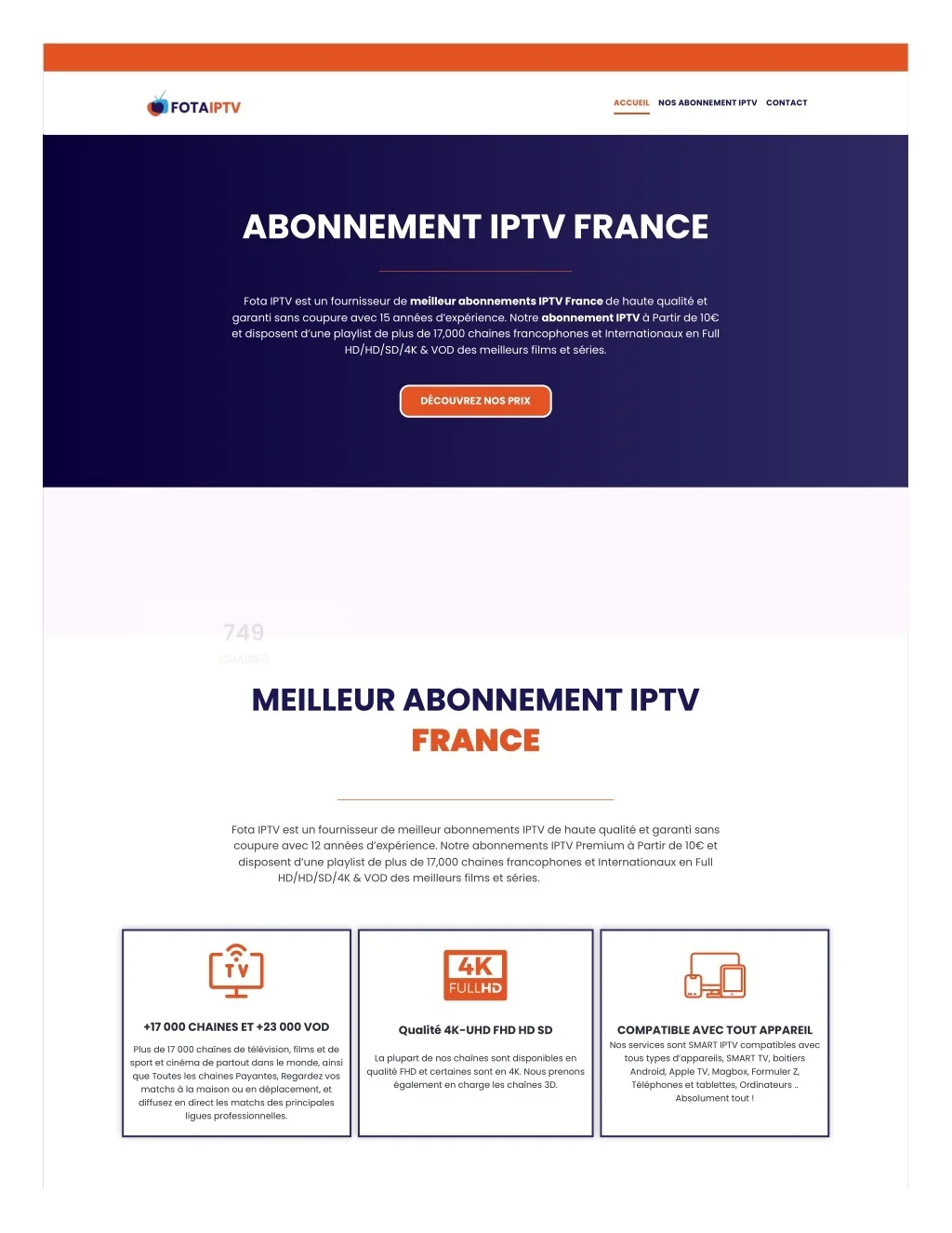 ACCUEIL NOS ABONNEMENT IPTV CONTACT ABONNEMENT IPTV FRANCE Fota IPTV est un fournisseur de meilleur abonnements IPTV France de haute qualité et garanti sans coupure avec 15 années d’expérience. Notre abonnement IPTV à Partir de 10€ et disposent d’une playlist de plus de 17,000 chaines francophones et Internationaux en Full HD/HD/SD/4K & VOD des meilleurs films et séries. DÉCOUVREZ NOS PRIX 749 CHAINES MEILLEUR ABONNEMENT IPTV FRANCE Fota IPTV est un fournisseur de meilleur abonnements IPTV de haute qualité et garanti sans coupure avec 12 années d’expérience. Notre abonnements IPTV Premium à Partir de 10€ et disposent d’une playlist de plus de 17,000 chaines francophones et Internationaux en Full HD/HD/SD/4K & VOD des meilleurs films et séries. abonnement iptv france +17 000 CHAINES ET +23 000 VOD Qualité 4K-UHD FHD HD SD COMPATIBLE AVEC TOUT APPAREIL Nos services sont SMART IPTV compatibles avec tous types d’appareils, SMART TV, boitiers Android, Apple TV, Magbox, Formuler Z, Téléphones et tablettes, Ordinateurs .. Absolument tout ! Plus de 17 000 chaînes de télévision, films et de sport et cinéma de partout dans le monde, ainsi que Toutes les chaines Payantes, Regardez vos matchs à la maison ou en déplacement, et diffusez en direct les matchs des principales ligues professionnelles. La plupart de nos chaînes sont disponibles en qualité FHD et certaines sont en 4K. Nous prenons également en charge les chaînes 3D.