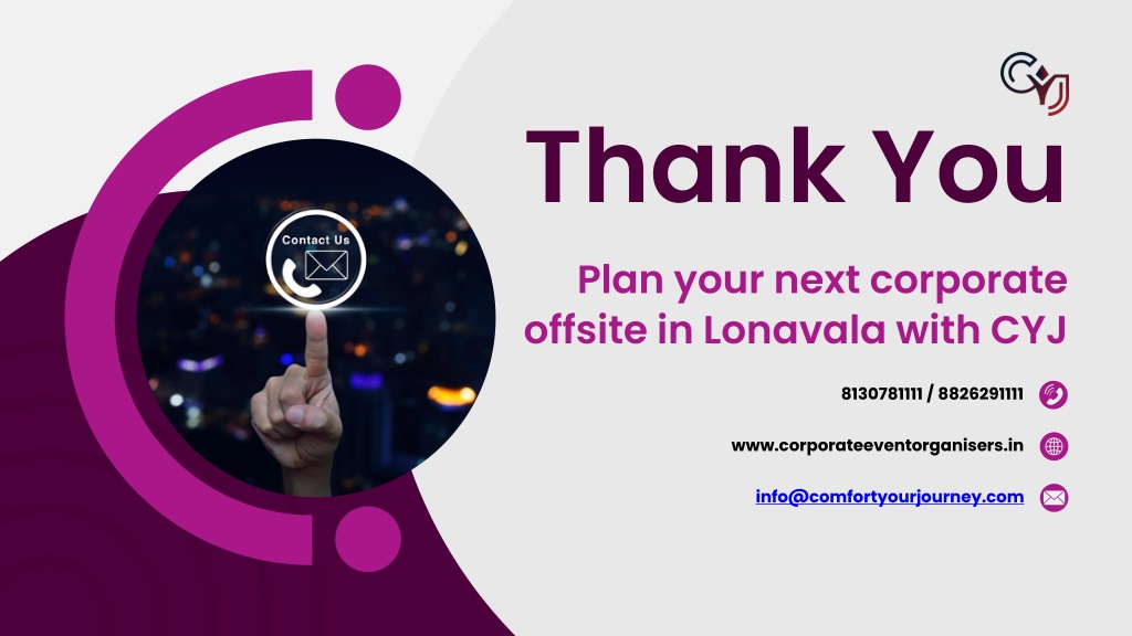 info@comfortyourjourney.com www.corporateeventorganisers.in 8130781111 / 8826291111 Thank You Plan your next corporate offsite in Lonavala with CYJ