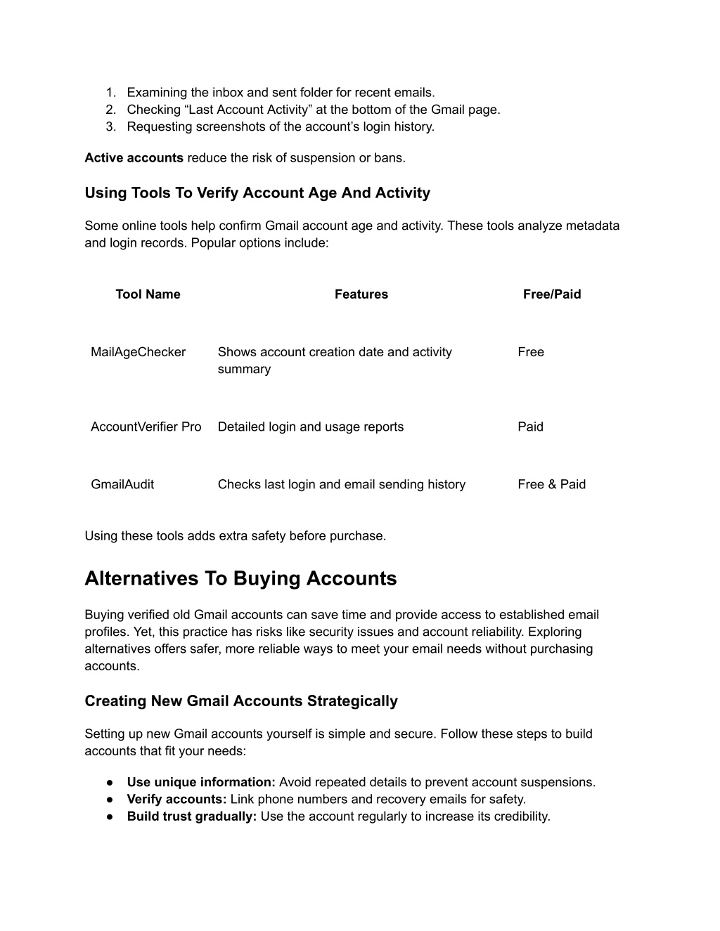 1. Examining the inbox and sent folder for recent emails. 2. Checking “Last Account Activity” at the bottom of the Gmail page. 3. Requesting screenshots of the account’s login history. Active accounts reduce the risk of suspension or bans. Using Tools To Verify Account Age And Activity Some online tools help confirm Gmail account age and activity. These tools analyze metadata and login records. Popular options include: Tool Name Features Free/Paid MailAgeChecker Shows account creation date and activity summary Free AccountVerifier Pro Detailed login and usage reports Paid GmailAudit Checks last login and email sending history Free & Paid Using these tools adds extra safety before purchase. Alternatives To Buying Accounts Buying verified old Gmail accounts can save time and provide access to established email profiles. Yet, this practice has risks like security issues and account reliability. Exploring alternatives offers safer, more reliable ways to meet your email needs without purchasing accounts. Creating New Gmail Accounts Strategically Setting up new Gmail accounts yourself is simple and secure. Follow these steps to build accounts that fit your needs: ● Use unique information: Avoid repeated details to prevent account suspensions. ● Verify accounts: Link phone numbers and recovery emails for safety. ● Build trust gradually: Use the account regularly to increase its credibility.
