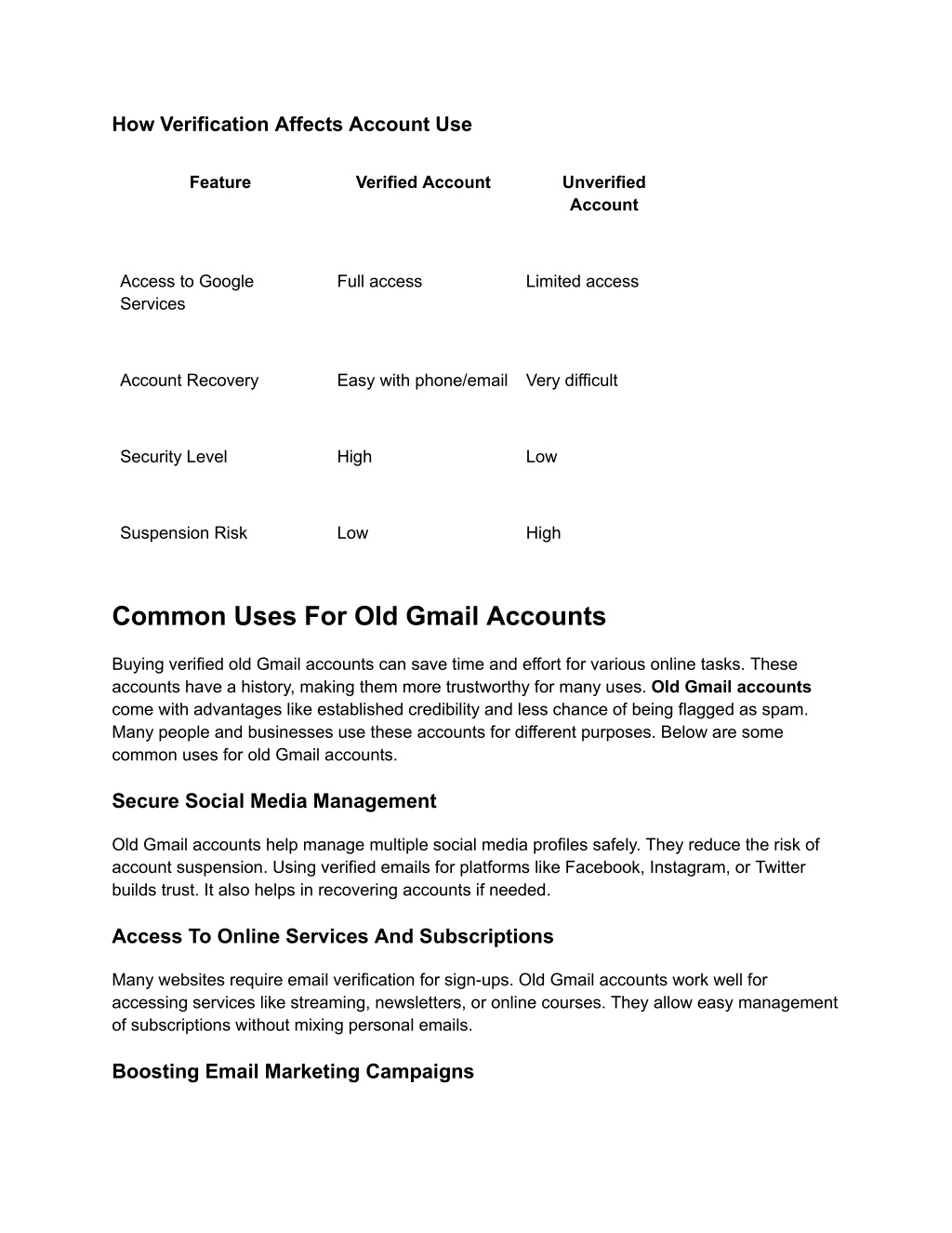 How Verification Affects Account Use Feature Verified Account Unverified Account Access to Google Services Full access Limited access Account Recovery Easy with phone/email Very difficult Security Level High Low Suspension Risk Low High Common Uses For Old Gmail Accounts Buying verified old Gmail accounts can save time and effort for various online tasks. These accounts have a history, making them more trustworthy for many uses. Old Gmail accounts come with advantages like established credibility and less chance of being flagged as spam. Many people and businesses use these accounts for different purposes. Below are some common uses for old Gmail accounts. Secure Social Media Management Old Gmail accounts help manage multiple social media profiles safely. They reduce the risk of account suspension. Using verified emails for platforms like Facebook, Instagram, or Twitter builds trust. It also helps in recovering accounts if needed. Access To Online Services And Subscriptions Many websites require email verification for sign-ups. Old Gmail accounts work well for accessing services like streaming, newsletters, or online courses. They allow easy management of subscriptions without mixing personal emails. Boosting Email Marketing Campaigns