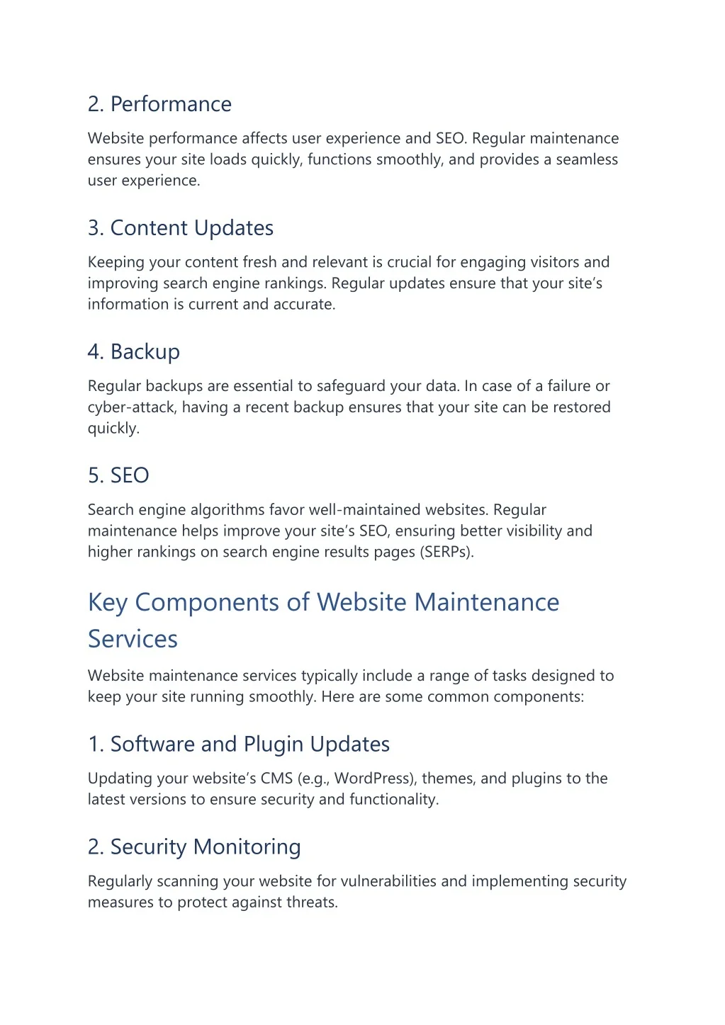 2. Performance Website performance affects user experience and SEO. Regular maintenance ensures your site loads quickly, functions smoothly, and provides a seamless user experience. 3. Content Updates Keeping your content fresh and relevant is crucial for engaging visitors and improving search engine rankings. Regular updates ensure that your site’s information is current and accurate. 4. Backup Regular backups are essential to safeguard your data. In case of a failure or cyber-attack, having a recent backup ensures that your site can be restored quickly. 5. SEO Search engine algorithms favor well-maintained websites. Regular maintenance helps improve your site’s SEO, ensuring better visibility and higher rankings on search engine results pages (SERPs). Key Components of Website Maintenance Services Website maintenance services typically include a range of tasks designed to keep your site running smoothly. Here are some common components: 1. Software and Plugin Updates Updating your website’s CMS (e.g., WordPress), themes, and plugins to the latest versions to ensure security and functionality. 2. Security Monitoring Regularly scanning your website for vulnerabilities and implementing security measures to protect against threats.