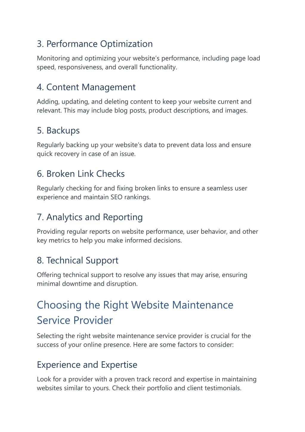 3. Performance Optimization Monitoring and optimizing your website’s performance, including page load speed, responsiveness, and overall functionality. 4. Content Management Adding, updating, and deleting content to keep your website current and relevant. This may include blog posts, product descriptions, and images. 5. Backups Regularly backing up your website’s data to prevent data loss and ensure quick recovery in case of an issue. 6. Broken Link Checks Regularly checking for and fixing broken links to ensure a seamless user experience and maintain SEO rankings. 7. Analytics and Reporting Providing regular reports on website performance, user behavior, and other key metrics to help you make informed decisions. 8. Technical Support Offering technical support to resolve any issues that may arise, ensuring minimal downtime and disruption. Choosing the Right Website Maintenance Service Provider Selecting the right website maintenance service provider is crucial for the success of your online presence. Here are some factors to consider: Experience and Expertise Look for a provider with a proven track record and expertise in maintaining websites similar to yours. Check their portfolio and client testimonials.