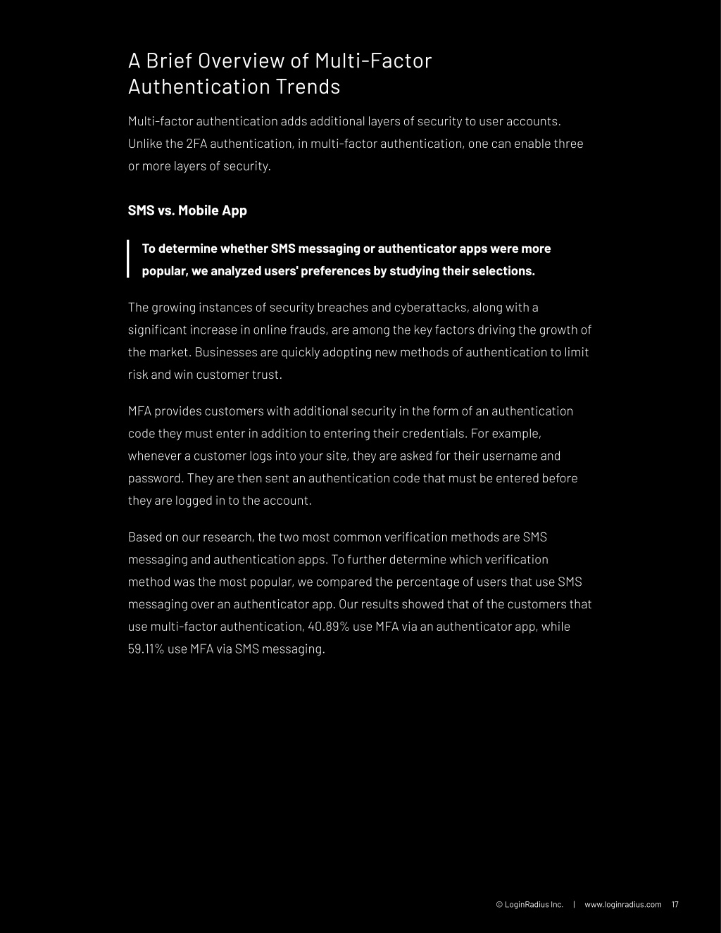 A Brief Overview of Multi-Factor Authentication Trends Multi-factor authentication adds additional layers of security to user accounts Unlike the 2FA authentication, in multi-factor authentication, one can enable three or more layers of security SMS vs. Mobile App To determine whether SMS messaging or authenticator apps were more popular, we analyzed users' preferences by studying their selections. The growing instances of security breaches and cyberattacks, along with a significant increase in online frauds, are among the key factors driving the growth of the market Businesses are quickly adopting new methods of authentication to limit risk and win customer trust MFA provides customers with additional security in the form of an authentication code they must enter in addition to entering their credentials For example, whenever a customer logs into your site, they are asked for their username and password They are then sent an authentication code that must be entered before they are logged in to the account Based on our research, the two most common verification methods are SMS messaging and authentication apps. To further determine which verification method was the most popular, we compared the percentage of users that use SMS messaging over an authenticator app Our results showed that of the customers that use multi-factor authentication, 40.89% use MFA via an authenticator app, while 59.11% use MFA via SMS messaging. © LoginRadius Inc. | www.loginradius.com 17