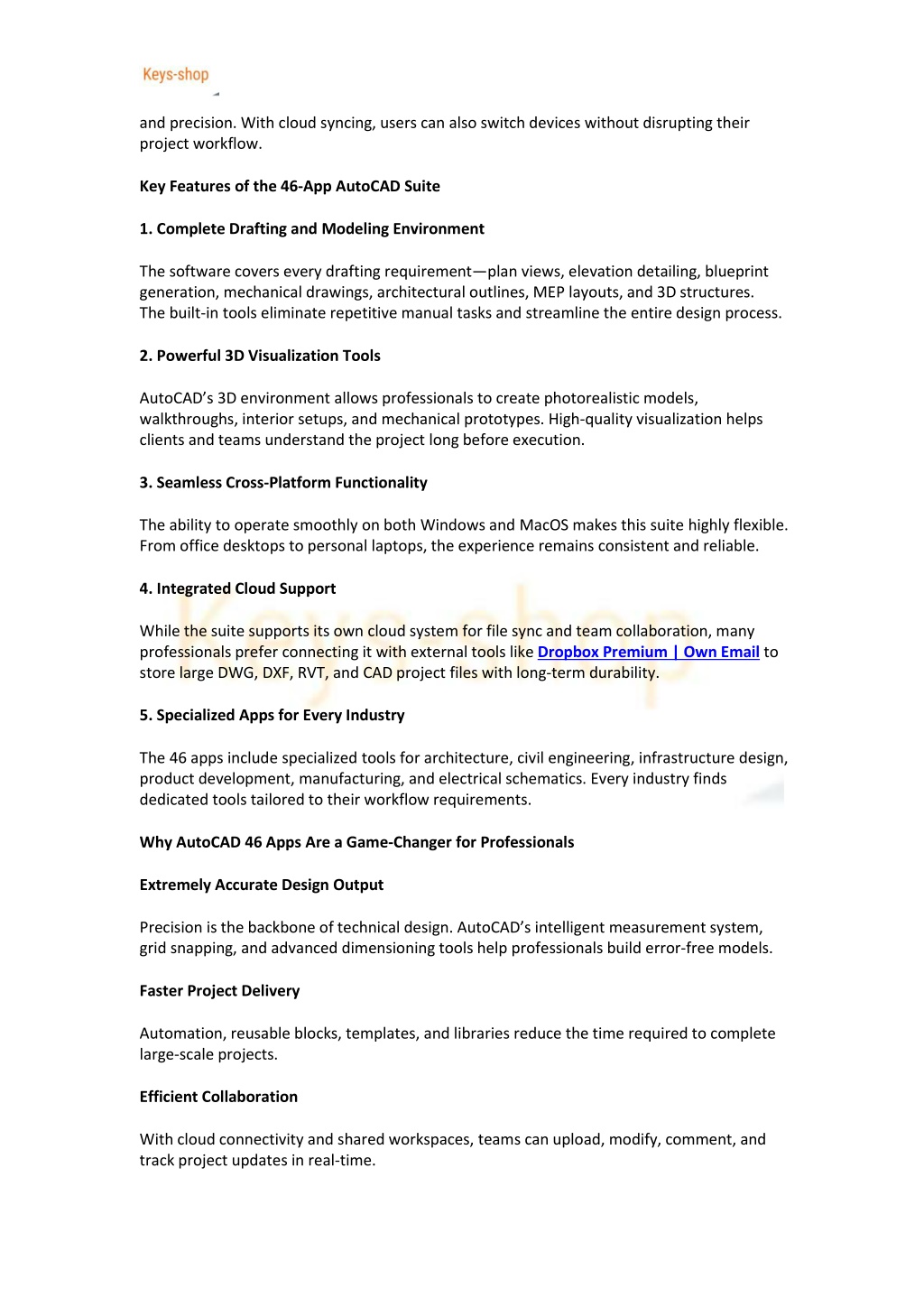 and precision. With cloud syncing, users can also switch devices without disrupting their project workflow. Key Features of the 46-App AutoCAD Suite 1. Complete Drafting and Modeling Environment The software covers every drafting requirement—plan views, elevation detailing, blueprint generation, mechanical drawings, architectural outlines, MEP layouts, and 3D structures. The built-in tools eliminate repetitive manual tasks and streamline the entire design process. 2. Powerful 3D Visualization Tools AutoCAD’s 3D environment allows professionals to create photorealistic models, walkthroughs, interior setups, and mechanical prototypes. High-quality visualization helps clients and teams understand the project long before execution. 3. Seamless Cross-Platform Functionality The ability to operate smoothly on both Windows and MacOS makes this suite highly flexible. From office desktops to personal laptops, the experience remains consistent and reliable. 4. Integrated Cloud Support While the suite supports its own cloud system for file sync and team collaboration, many professionals prefer connecting it with external tools like Dropbox Premium | Own Email to store large DWG, DXF, RVT, and CAD project files with long-term durability. 5. Specialized Apps for Every Industry The 46 apps include specialized tools for architecture, civil engineering, infrastructure design, product development, manufacturing, and electrical schematics. Every industry finds dedicated tools tailored to their workflow requirements. Why AutoCAD 46 Apps Are a Game-Changer for Professionals Extremely Accurate Design Output Precision is the backbone of technical design. AutoCAD’s intelligent measurement system, grid snapping, and advanced dimensioning tools help professionals build error-free models. Faster Project Delivery Automation, reusable blocks, templates, and libraries reduce the time required to complete large-scale projects. Efficient Collaboration With cloud connectivity and shared workspaces, teams can upload, modify, comment, and track project updates in real-time.
