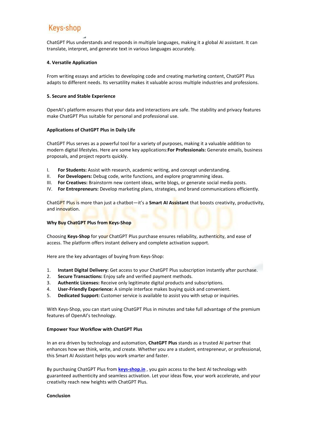 3. ChatGPT Plus understands and responds in multiple languages, making it a global AI assistant. It can translate, interpret, and generate text in various languages accurately. 4. Versatile Application From writing essays and articles to developing code and creating marketing content, ChatGPT Plus adapts to different needs. Its versatility makes it valuable across multiple industries and professions. 5. Secure and Stable Experience OpenAI’s platform ensures that your data and interactions are safe. The stability and privacy features make ChatGPT Plus suitable for personal and professional use. Applications of ChatGPT Plus in Daily Life ChatGPT Plus serves as a powerful tool for a variety of purposes, making it a valuable addition to modern digital lifestyles. Here are some key applications:For Professionals: Generate emails, business proposals, and project reports quickly. I. II. III. IV. For Students: Assist with research, academic writing, and concept understanding. For Developers: Debug code, write functions, and explore programming ideas. For Creatives: Brainstorm new content ideas, write blogs, or generate social media posts. For Entrepreneurs: Develop marketing plans, strategies, and brand communications efficiently. ChatGPT Plus is more than just a chatbot—it’s a Smart AI Assistant that boosts creativity, productivity, and innovation. Why Buy ChatGPT Plus from Keys-Shop Choosing Keys-Shop for your ChatGPT Plus purchase ensures reliability, authenticity, and ease of access. The platform offers instant delivery and complete activation support. Here are the key advantages of buying from Keys-Shop: 1. 2. 3. 4. 5. Instant Digital Delivery: Get access to your ChatGPT Plus subscription instantly after purchase. Secure Transactions: Enjoy safe and verified payment methods. Authentic Licenses: Receive only legitimate digital products and subscriptions. User-Friendly Experience: A simple interface makes buying quick and convenient. Dedicated Support: Customer service is available to assist you with setup or inquiries. With Keys-Shop, you can start using ChatGPT Plus in minutes and take full advantage of the premium features of OpenAI’s technology. Empower Your Workflow with ChatGPT Plus In an era driven by technology and automation, ChatGPT Plus stands as a trusted AI partner that enhances how we think, write, and create. Whether you are a student, entrepreneur, or professional, this Smart AI Assistant helps you work smarter and faster. By purchasing ChatGPT Plus from keys-shop.in , you gain access to the best AI technology with guaranteed authenticity and seamless activation. Let your ideas flow, your work accelerate, and your creativity reach new heights with ChatGPT Plus. Conclusion
