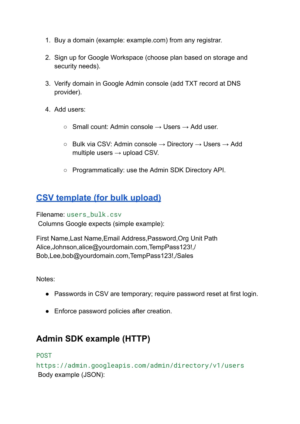 3. 1. Buy a domain (example: example.com) from any registrar. 2. Sign up for Google Workspace (choose plan based on storage and security needs). 3. Verify domain in Google Admin console (add TXT record at DNS provider). 4. Add users: ○ Small count: Admin console → Users → Add user. ○ Bulk via CSV: Admin console → Directory → Users → Add multiple users → upload CSV. ○ Programmatically: use the Admin SDK Directory API. CSV template (for bulk upload) Filename: users_bulk.csv Columns Google expects (simple example): First Name,Last Name,Email Address,Password,Org Unit Path Alice,Johnson,alice@yourdomain.com,TempPass123!,/ Bob,Lee,bob@yourdomain.com,TempPass123!,/Sales Notes: ● Passwords in CSV are temporary; require password reset at first login. ● Enforce password policies after creation. Admin SDK example (HTTP) POST https://admin.googleapis.com/admin/directory/v1/users Body example (JSON):