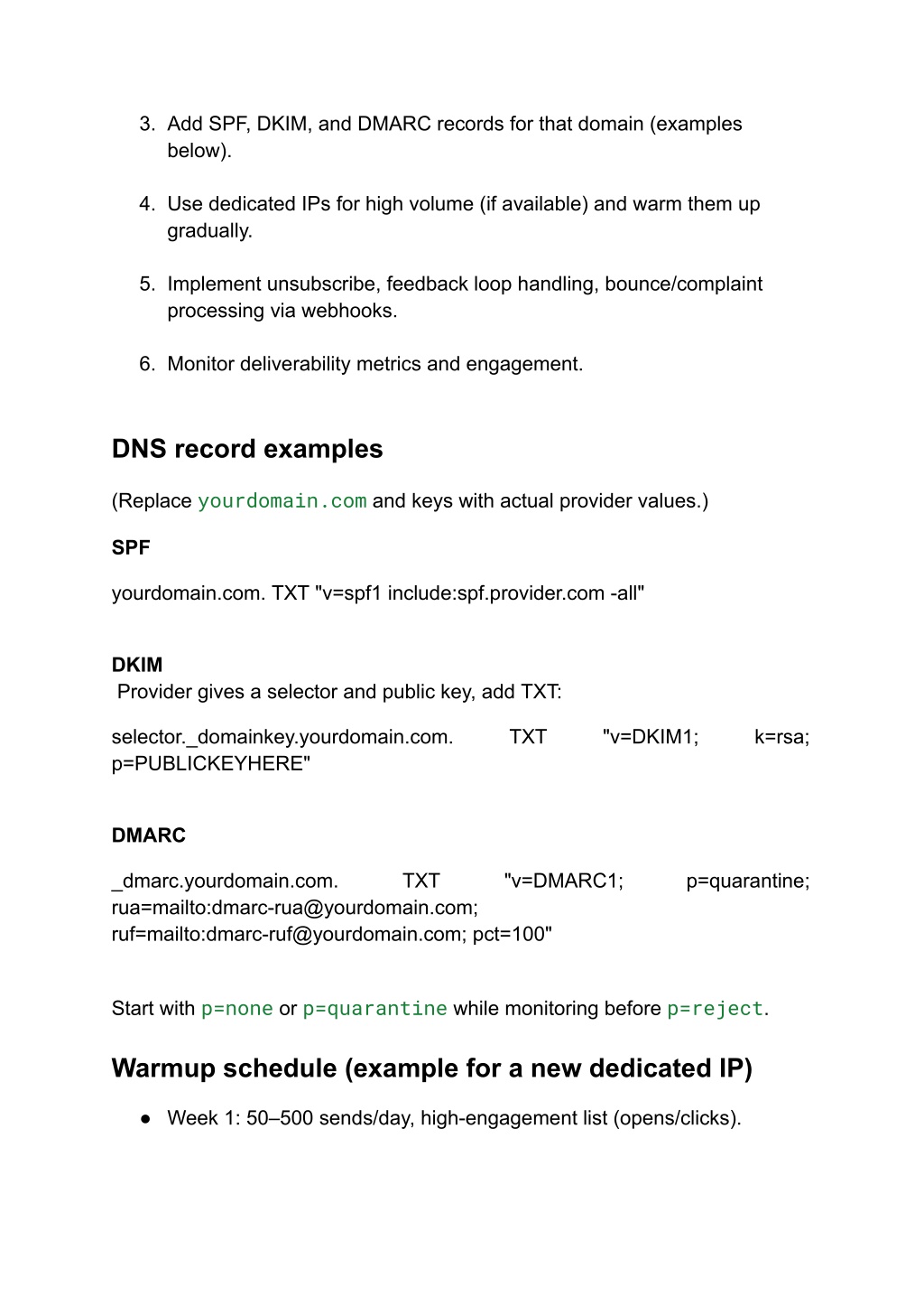 6. 3. Add SPF, DKIM, and DMARC records for that domain (examples below). 4. Use dedicated IPs for high volume (if available) and warm them up gradually. 5. Implement unsubscribe, feedback loop handling, bounce/complaint processing via webhooks. 6. Monitor deliverability metrics and engagement. DNS record examples (Replace yourdomain.com and keys with actual provider values.) SPF yourdomain.com. TXT "v=spf1 include:spf.provider.com -all" DKIM Provider gives a selector and public key, add TXT: selector._domainkey.yourdomain.com. p=PUBLICKEYHERE" TXT "v=DKIM1; k=rsa; DMARC _dmarc.yourdomain.com. rua=mailto:dmarc-rua@yourdomain.com; ruf=mailto:dmarc-ruf@yourdomain.com; pct=100" TXT "v=DMARC1; p=quarantine; Start with p=none or p=quarantine while monitoring before p=reject. Warmup schedule (example for a new dedicated IP) ● Week 1: 50–500 sends/day, high-engagement list (opens/clicks).