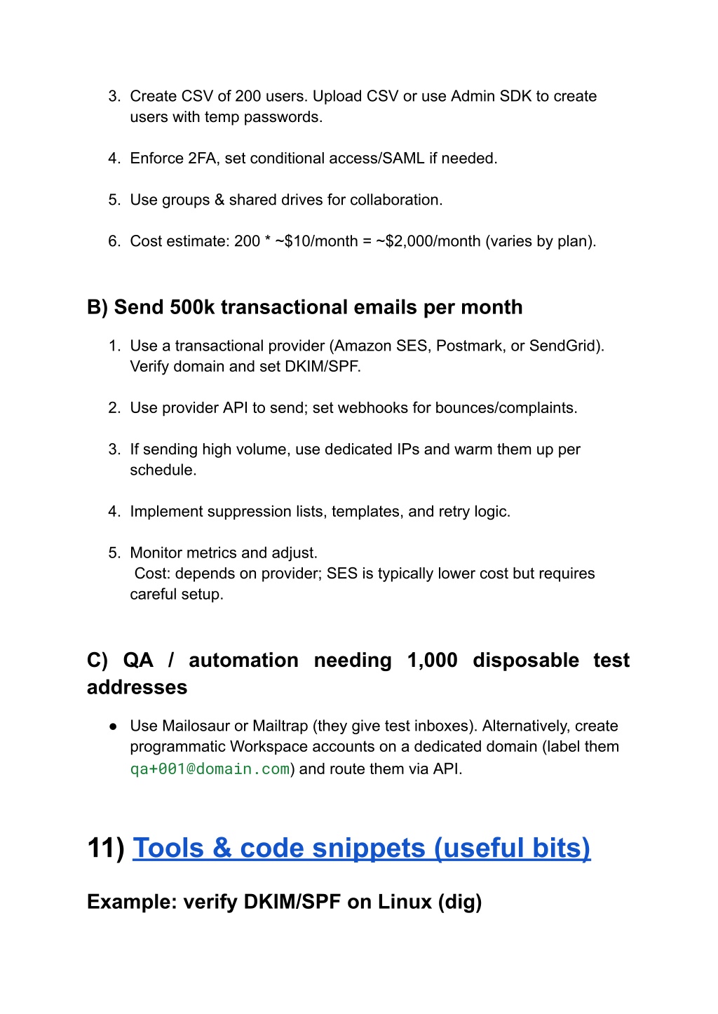 11. 3. Create CSV of 200 users. Upload CSV or use Admin SDK to create users with temp passwords. 4. Enforce 2FA, set conditional access/SAML if needed. 5. Use groups & shared drives for collaboration. 6. Cost estimate: 200 * ~$10/month = ~$2,000/month (varies by plan). B) Send 500k transactional emails per month 1. Use a transactional provider (Amazon SES, Postmark, or SendGrid). Verify domain and set DKIM/SPF. 2. Use provider API to send; set webhooks for bounces/complaints. 3. If sending high volume, use dedicated IPs and warm them up per schedule. 4. Implement suppression lists, templates, and retry logic. 5. Monitor metrics and adjust. Cost: depends on provider; SES is typically lower cost but requires careful setup. C) QA / automation needing 1,000 disposable test addresses ● Use Mailosaur or Mailtrap (they give test inboxes). Alternatively, create programmatic Workspace accounts on a dedicated domain (label them qa+001@domain.com) and route them via API. 11) Tools & code snippets (useful bits) Example: verify DKIM/SPF on Linux (dig)