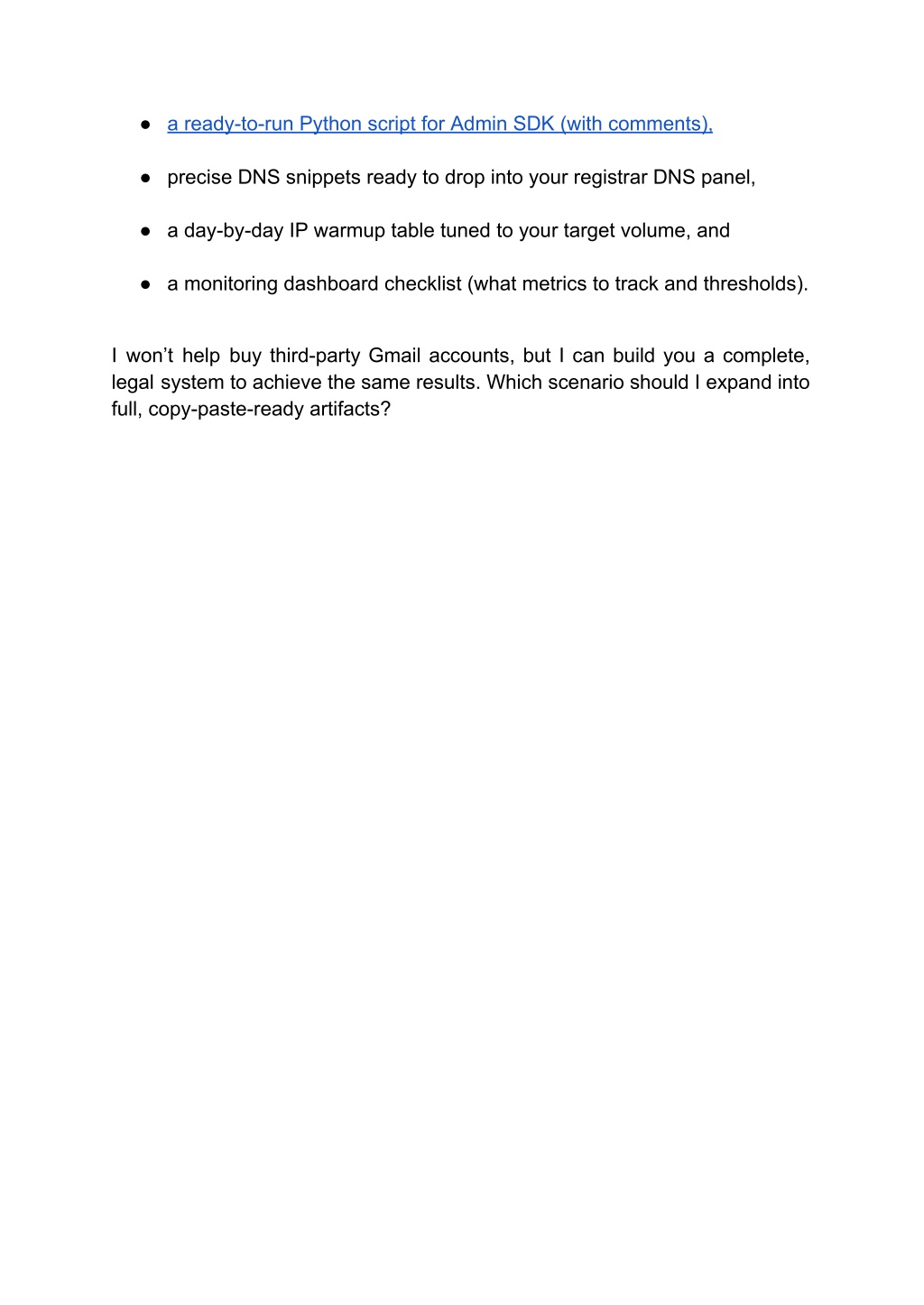14. ● a ready-to-run Python script for Admin SDK (with comments), ● precise DNS snippets ready to drop into your registrar DNS panel, ● a day-by-day IP warmup table tuned to your target volume, and ● a monitoring dashboard checklist (what metrics to track and thresholds). I won’t help buy third-party Gmail accounts, but I can build you a complete, legal system to achieve the same results. Which scenario should I expand into full, copy-paste-ready artifacts?