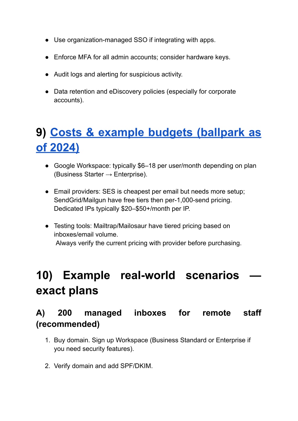 10. ● Use organization-managed SSO if integrating with apps. ● Enforce MFA for all admin accounts; consider hardware keys. ● Audit logs and alerting for suspicious activity. ● Data retention and eDiscovery policies (especially for corporate accounts). 9) Costs & example budgets (ballpark as of 2024) ● Google Workspace: typically $6–18 per user/month depending on plan (Business Starter → Enterprise). ● Email providers: SES is cheapest per email but needs more setup; SendGrid/Mailgun have free tiers then per-1,000-send pricing. Dedicated IPs typically $20–$50+/month per IP. ● Testing tools: Mailtrap/Mailosaur have tiered pricing based on inboxes/email volume. Always verify the current pricing with provider before purchasing. 10) Example real-world scenarios — exact plans A) (recommended) 200 managed inboxes for remote staff 1. Buy domain. Sign up Workspace (Business Standard or Enterprise if you need security features). 2. Verify domain and add SPF/DKIM.