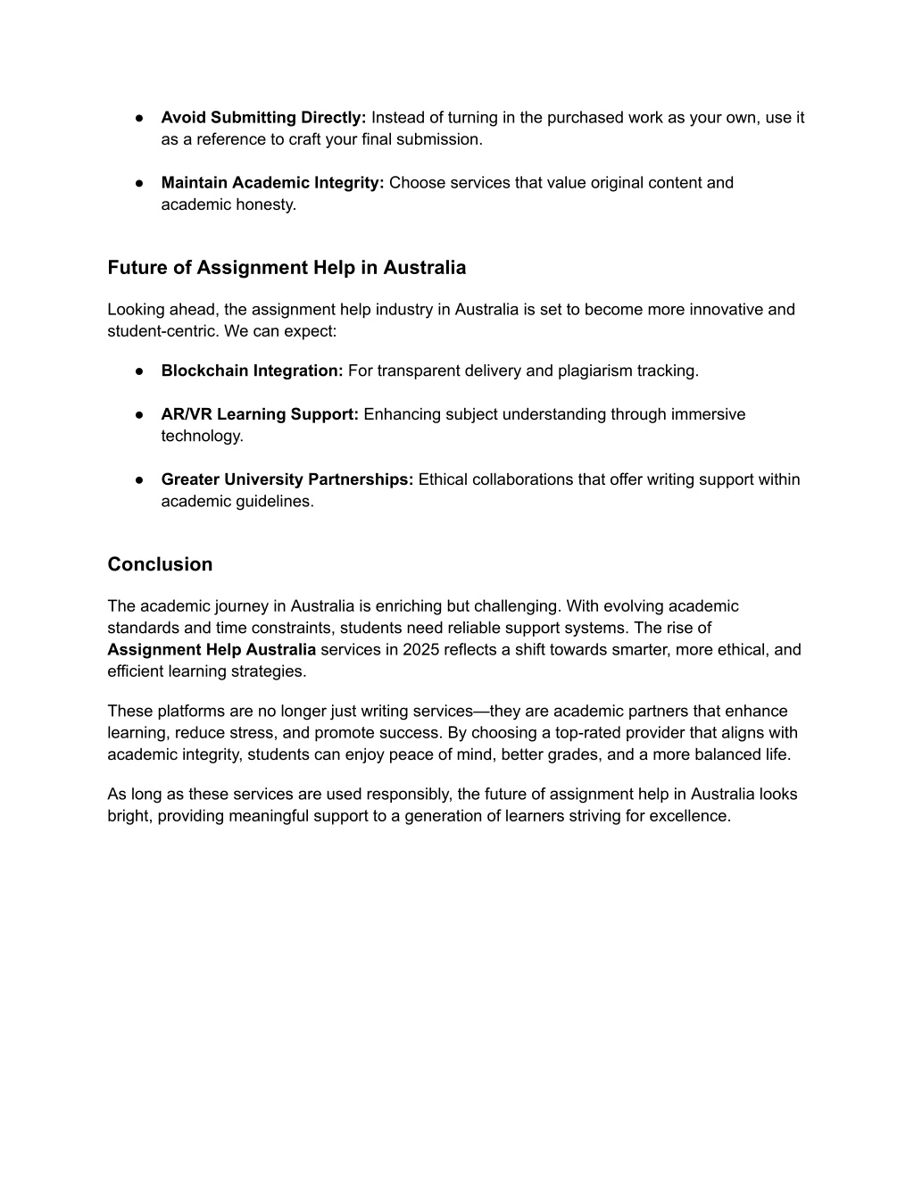 ● Avoid Submitting Directly: Instead of turning in the purchased work as your own, use it as a reference to craft your final submission. ● Maintain Academic Integrity: Choose services that value original content and academic honesty. Future of Assignment Help in Australia Looking ahead, the assignment help industry in Australia is set to become more innovative and student-centric. We can expect: ● Blockchain Integration: For transparent delivery and plagiarism tracking. ● AR/VR Learning Support: Enhancing subject understanding through immersive technology. ● Greater University Partnerships: Ethical collaborations that offer writing support within academic guidelines. Conclusion The academic journey in Australia is enriching but challenging. With evolving academic standards and time constraints, students need reliable support systems. The rise of Assignment Help Australia services in 2025 reflects a shift towards smarter, more ethical, and efficient learning strategies. These platforms are no longer just writing services—they are academic partners that enhance learning, reduce stress, and promote success. By choosing a top-rated provider that aligns with academic integrity, students can enjoy peace of mind, better grades, and a more balanced life. As long as these services are used responsibly, the future of assignment help in Australia looks bright, providing meaningful support to a generation of learners striving for excellence.