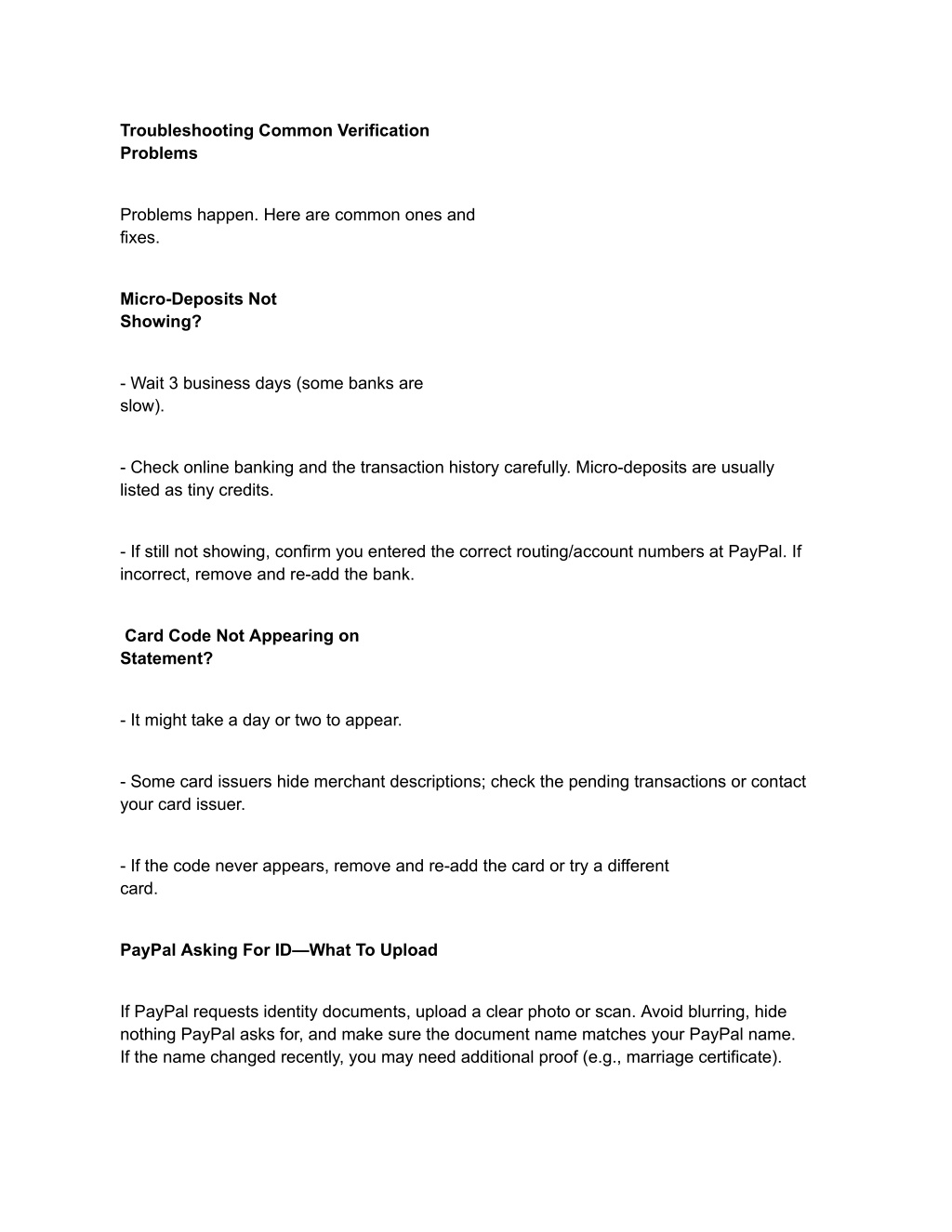 7. Troubleshooting Common Verification Problems Problems happen. Here are common ones and fixes. Micro-Deposits Not Showing? - Wait 3 business days (some banks are slow). - Check online banking and the transaction history carefully. Micro-deposits are usually listed as tiny credits. - If still not showing, confirm you entered the correct routing/account numbers at PayPal. If incorrect, remove and re-add the bank. Card Code Not Appearing on Statement? - It might take a day or two to appear. - Some card issuers hide merchant descriptions; check the pending transactions or contact your card issuer. - If the code never appears, remove and re-add the card or try a different card. PayPal Asking For ID—What To Upload If PayPal requests identity documents, upload a clear photo or scan. Avoid blurring, hide nothing PayPal asks for, and make sure the document name matches your PayPal name. If the name changed recently, you may need additional proof (e.g., marriage certificate).
