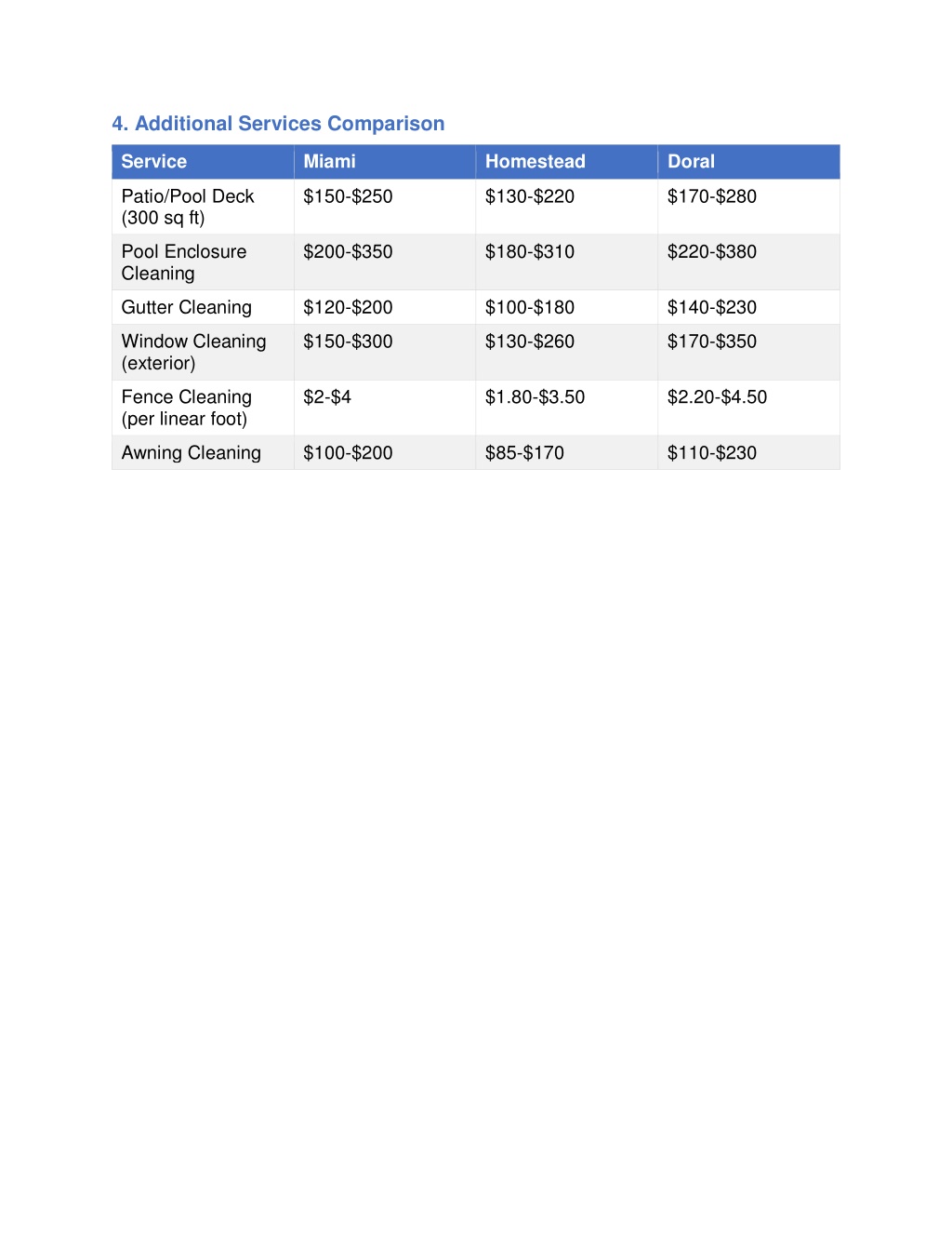 4. Additional Services Comparison Service Miami Homestead Doral Patio/Pool Deck (300 sq ft) $150-$250 $130-$220 $170-$280 Pool Enclosure Cleaning $200-$350 $180-$310 $220-$380 Gutter Cleaning $120-$200 $100-$180 $140-$230 Window Cleaning (exterior) $150-$300 $130-$260 $170-$350 Fence Cleaning (per linear foot) $2-$4 $1.80-$3.50 $2.20-$4.50 Awning Cleaning $100-$200 $85-$170 $110-$230