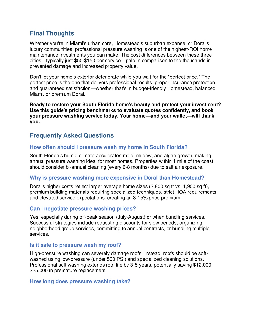 Final Thoughts Whether you're in Miami's urban core, Homestead's suburban expanse, or Doral's luxury communities, professional pressure washing is one of the highest-ROI home maintenance investments you can make. The cost differences between these three cities—typically just $50-$150 per service—pale in comparison to the thousands in prevented damage and increased property value. Don't let your home's exterior deteriorate while you wait for the "perfect price." The perfect price is the one that delivers professional results, proper insurance protection, and guaranteed satisfaction—whether that's in budget-friendly Homestead, balanced Miami, or premium Doral. Ready to restore your South Florida home's beauty and protect your investment? Use this guide's pricing benchmarks to evaluate quotes confidently, and book your pressure washing service today. Your home—and your wallet—will thank you. Frequently Asked Questions How often should I pressure wash my home in South Florida? South Florida's humid climate accelerates mold, mildew, and algae growth, making annual pressure washing ideal for most homes. Properties within 1 mile of the coast should consider bi-annual cleaning (every 6-8 months) due to salt air exposure. Why is pressure washing more expensive in Doral than Homestead? Doral's higher costs reflect larger average home sizes (2,800 sq ft vs. 1,900 sq ft), premium building materials requiring specialized techniques, strict HOA requirements, and elevated service expectations, creating an 8-15% price premium. Can I negotiate pressure washing prices? Yes, especially during off-peak season (July-August) or when bundling services. Successful strategies include requesting discounts for slow periods, organizing neighborhood group services, committing to annual contracts, or bundling multiple services. Is it safe to pressure wash my roof? High-pressure washing can severely damage roofs. Instead, roofs should be soft- washed using low-pressure (under 500 PSI) and specialized cleaning solutions. Professional soft washing extends roof life by 3-5 years, potentially saving $12,000- $25,000 in premature replacement. How long does pressure washing take?