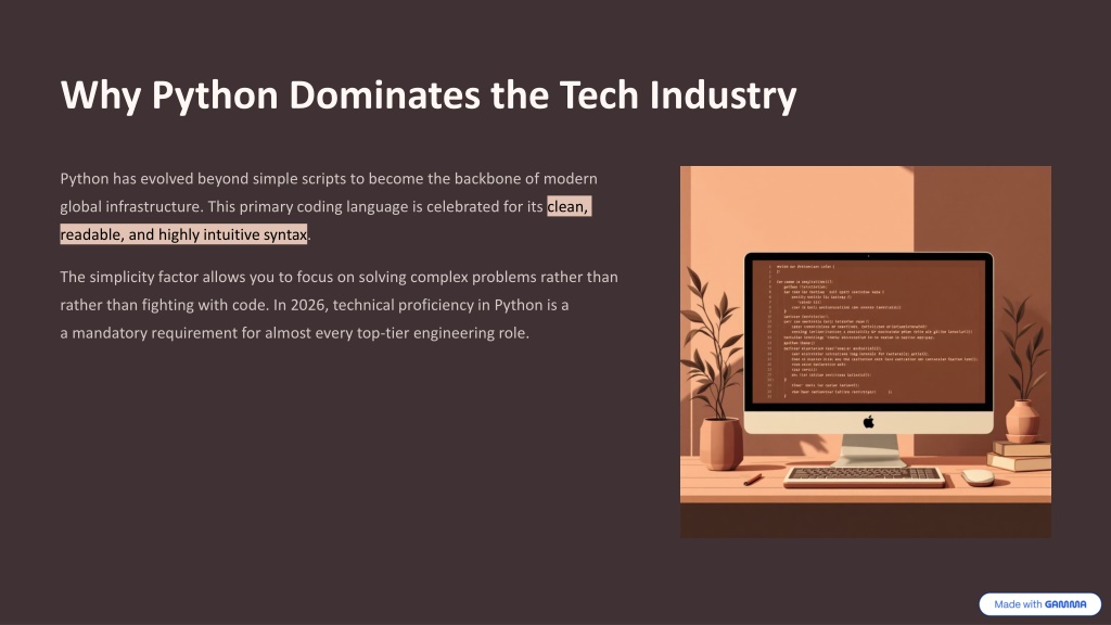 Why Python Dominates the Tech Industry Python has evolved beyond simple scripts to become the backbone of modern global infrastructure. This primary coding language is celebrated for its clean, readable, and highly intuitive syntax. The simplicity factor allows you to focus on solving complex problems rather than fighting with code. In 2026, technical proficiency in Python is a mandatory requirement for almost every top-tier engineering role.