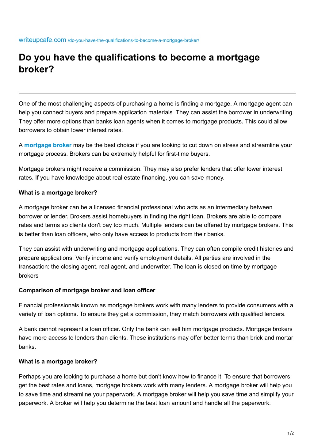 writeupcafe.com/do-you-have-the-qualifications-to-become-a-mortgage-broker/writeupcafe.com/do-you-have-the-qualifications-to-become-a-mortgage-broker/ Do you have the qualifications to become a mortgage broker? One of the most challenging aspects of purchasing a home is finding a mortgage. A mortgage agent can help you connect buyers and prepare application materials. They can assist the borrower in underwriting. They offer more options than banks loan agents when it comes to mortgage products. This could allow borrowers to obtain lower interest rates. A mortgage broker may be the best choice if you are looking to cut down on stress and streamline your mortgage process. Brokers can be extremely helpful for first-time buyers. Mortgage brokers might receive a commission. They may also prefer lenders that offer lower interest rates. If you have knowledge about real estate financing, you can save money. What is a mortgage broker? A mortgage broker can be a licensed financial professional who acts as an intermediary between borrower or lender. Brokers assist homebuyers in finding the right loan. Brokers are able to compare rates and terms so clients don't pay too much. Multiple lenders can be offered by mortgage brokers. This is better than loan officers, who only have access to products from their banks. They can assist with underwriting and mortgage applications. They can often compile credit histories and prepare applications. Verify income and verify employment details. All parties are involved in the transaction: the closing agent, real agent, and underwriter. The loan is closed on time by mortgage brokers Comparison of mortgage broker and loan officer Financial professionals known as mortgage brokers work with many lenders to provide consumers with a variety of loan options. To ensure they get a commission, they match borrowers with qualified lenders. A bank cannot represent a loan officer. Only the bank can sell him mortgage products. Mortgage brokers have more access to lenders than clients. These institutions may offer better terms than brick and mortar banks. What is a mortgage broker? Perhaps you are looking to purchase a home but don't know how to finance it. To ensure that borrowers get the best rates and loans, mortgage brokers work with many lenders. A mortgage broker will help you to save time and streamline your paperwork. A mortgage broker will help you save time and simplify your paperwork. A broker will help you determine the best loan amount and handle all the paperwork. 1/2