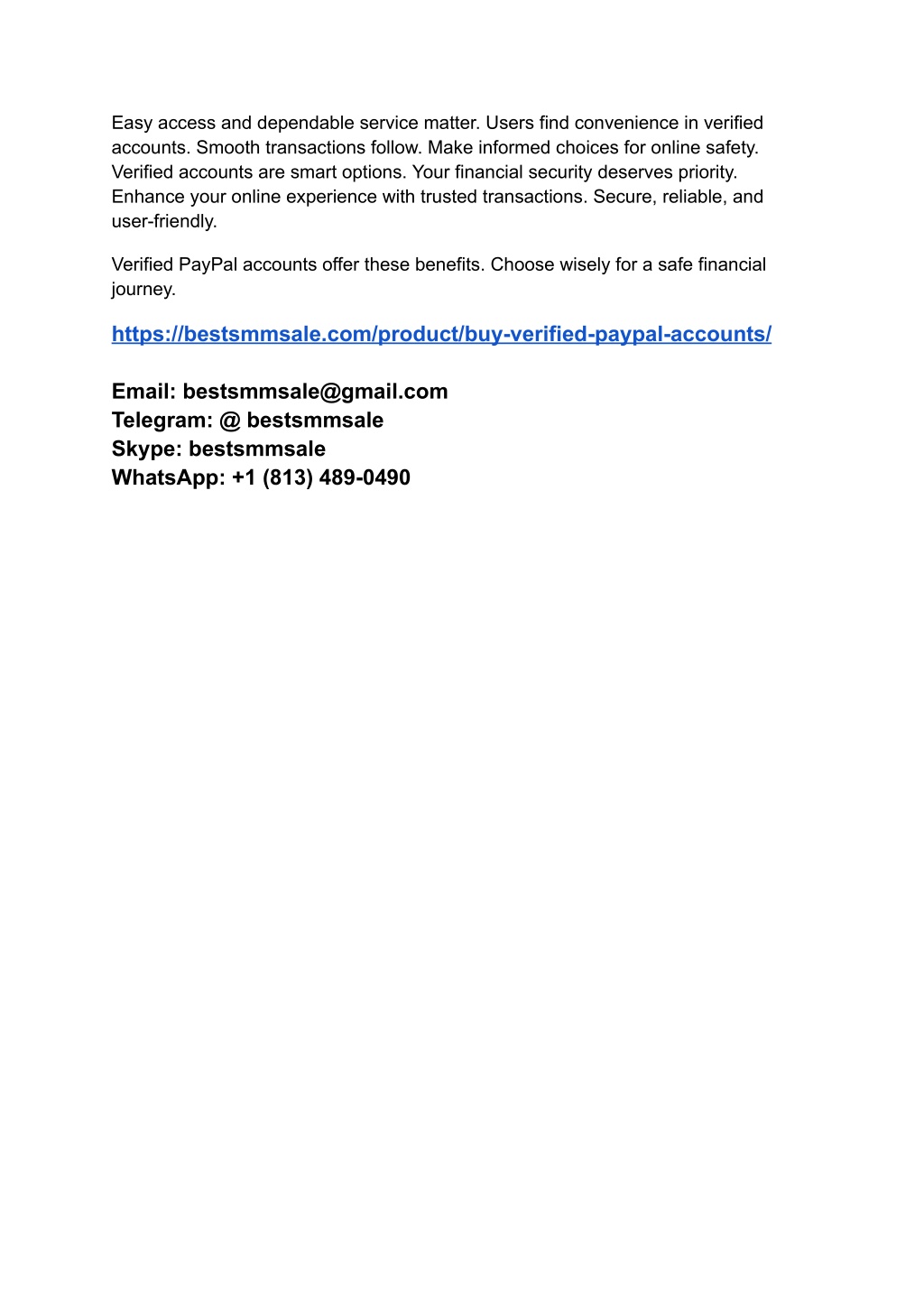 Easy access and dependable service matter. Users find convenience in verified accounts. Smooth transactions follow. Make informed choices for online safety. Verified accounts are smart options. Your financial security deserves priority. Enhance your online experience with trusted transactions. Secure, reliable, and user-friendly. Verified PayPal accounts offer these benefits. Choose wisely for a safe financial journey. https://bestsmmsale.com/product/buy-verified-paypal-accounts/ Email: bestsmmsale@gmail.com Telegram: @ bestsmmsale Skype: bestsmmsale WhatsApp: +1 (813) 489-0490