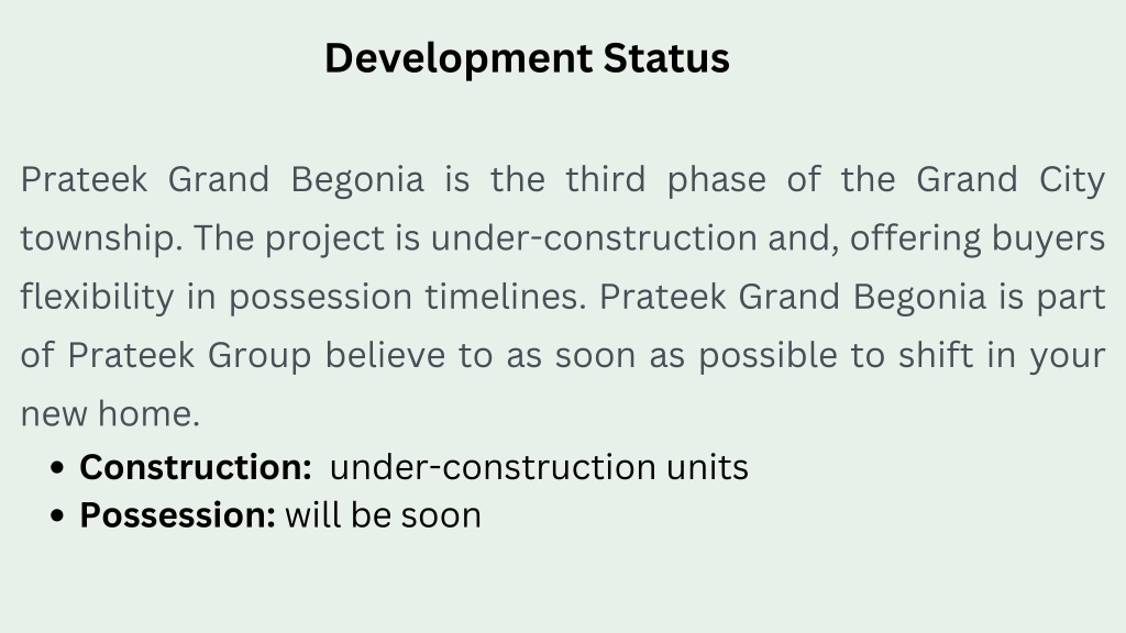 8. Development Status Prateek Grand Begonia is the third phase of the Grand City township. The project is under-construction and, offering buyers flexibility in possession timelines. Prateek Grand Begonia is part of Prateek Group believe to as soon as possible to shift in your new home. Construction: under-construction units Possession: will be soon