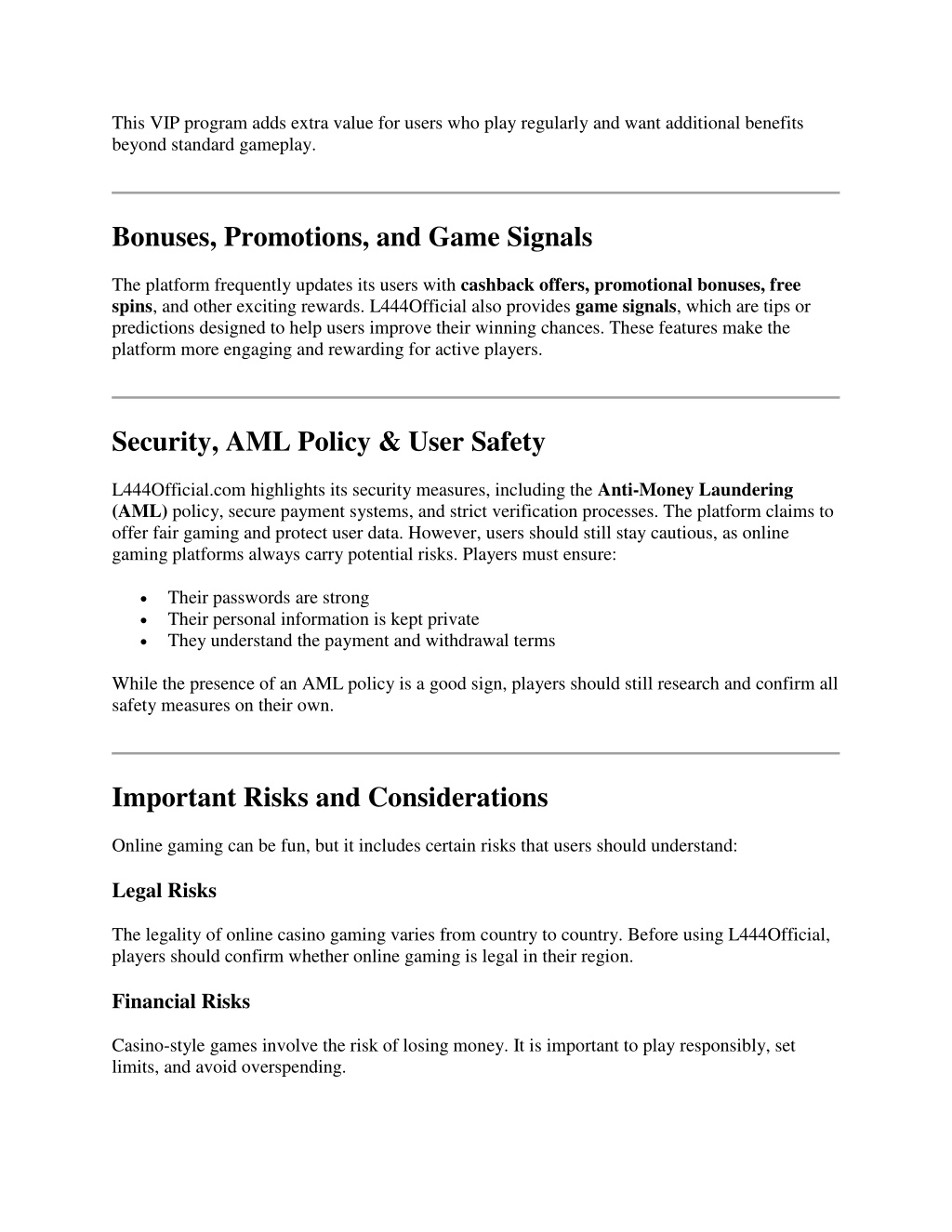3. This VIP program adds extra value for users who play regularly and want additional benefits beyond standard gameplay. Bonuses, Promotions, and Game Signals The platform frequently updates its users with cashback offers, promotional bonuses, free spins, and other exciting rewards. L444Official also provides game signals, which are tips or predictions designed to help users improve their winning chances. These features make the platform more engaging and rewarding for active players. Security, AML Policy & User Safety L444Official.com highlights its security measures, including the Anti-Money Laundering (AML) policy, secure payment systems, and strict verification processes. The platform claims to offer fair gaming and protect user data. However, users should still stay cautious, as online gaming platforms always carry potential risks. Players must ensure: Their passwords are strong Their personal information is kept private They understand the payment and withdrawal terms While the presence of an AML policy is a good sign, players should still research and confirm all safety measures on their own. Important Risks and Considerations Online gaming can be fun, but it includes certain risks that users should understand: Legal Risks The legality of online casino gaming varies from country to country. Before using L444Official, players should confirm whether online gaming is legal in their region. Financial Risks Casino-style games involve the risk of losing money. It is important to play responsibly, set limits, and avoid overspending.