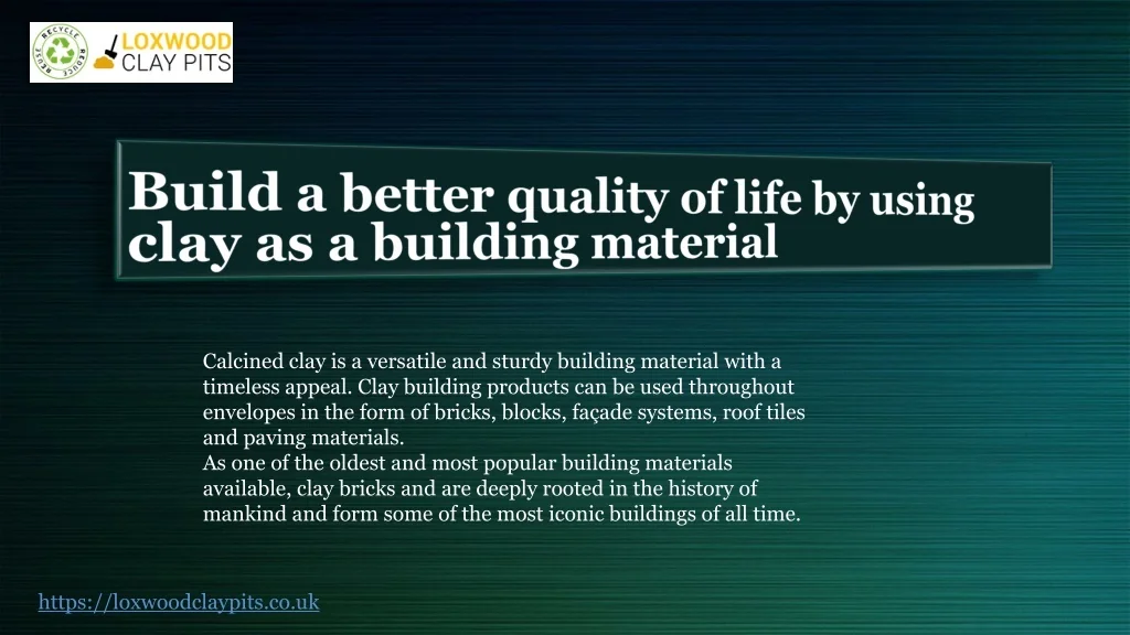 Build a better quality of life by using clay as a building material Calcined clay is a versatile and sturdy building material with a timeless appeal. Clay building products can be used throughout envelopes in the form of bricks, blocks, façade systems, roof tiles and paving materials. As one of the oldest and most popular building materials available, clay bricks and are deeply rooted in the history of mankind and form some of the most iconic buildings of all time. https://loxwoodclaypits.co.uk