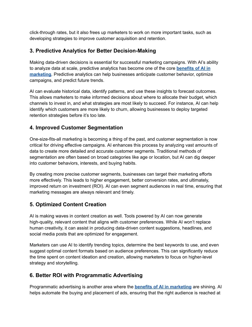 click-through rates, but it also frees up marketers to work on more important tasks, such as developing strategies to improve customer acquisition and retention. 3. Predictive Analytics for Better Decision-Making Making data-driven decisions is essential for successful marketing campaigns. With AI’s ability to analyze data at scale, predictive analytics has become one of the core benefits of AI in marketing. Predictive analytics can help businesses anticipate customer behavior, optimize campaigns, and predict future trends. AI can evaluate historical data, identify patterns, and use these insights to forecast outcomes. This allows marketers to make informed decisions about where to allocate their budget, which channels to invest in, and what strategies are most likely to succeed. For instance, AI can help identify which customers are more likely to churn, allowing businesses to deploy targeted retention strategies before it’s too late. 4. Improved Customer Segmentation One-size-fits-all marketing is becoming a thing of the past, and customer segmentation is now critical for driving effective campaigns. AI enhances this process by analyzing vast amounts of data to create more detailed and accurate customer segments. Traditional methods of segmentation are often based on broad categories like age or location, but AI can dig deeper into customer behaviors, interests, and buying habits. By creating more precise customer segments, businesses can target their marketing efforts more effectively. This leads to higher engagement, better conversion rates, and ultimately, improved return on investment (ROI). AI can even segment audiences in real time, ensuring that marketing messages are always relevant and timely. 5. Optimized Content Creation AI is making waves in content creation as well. Tools powered by AI can now generate high-quality, relevant content that aligns with customer preferences. While AI won’t replace human creativity, it can assist in producing data-driven content suggestions, headlines, and social media posts that are optimized for engagement. Marketers can use AI to identify trending topics, determine the best keywords to use, and even suggest optimal content formats based on audience preferences. This can significantly reduce the time spent on content ideation and creation, allowing marketers to focus on higher-level strategy and storytelling. 6. Better ROI with Programmatic Advertising Programmatic advertising is another area where the benefits of AI in marketing are shining. AI helps automate the buying and placement of ads, ensuring that the right audience is reached at