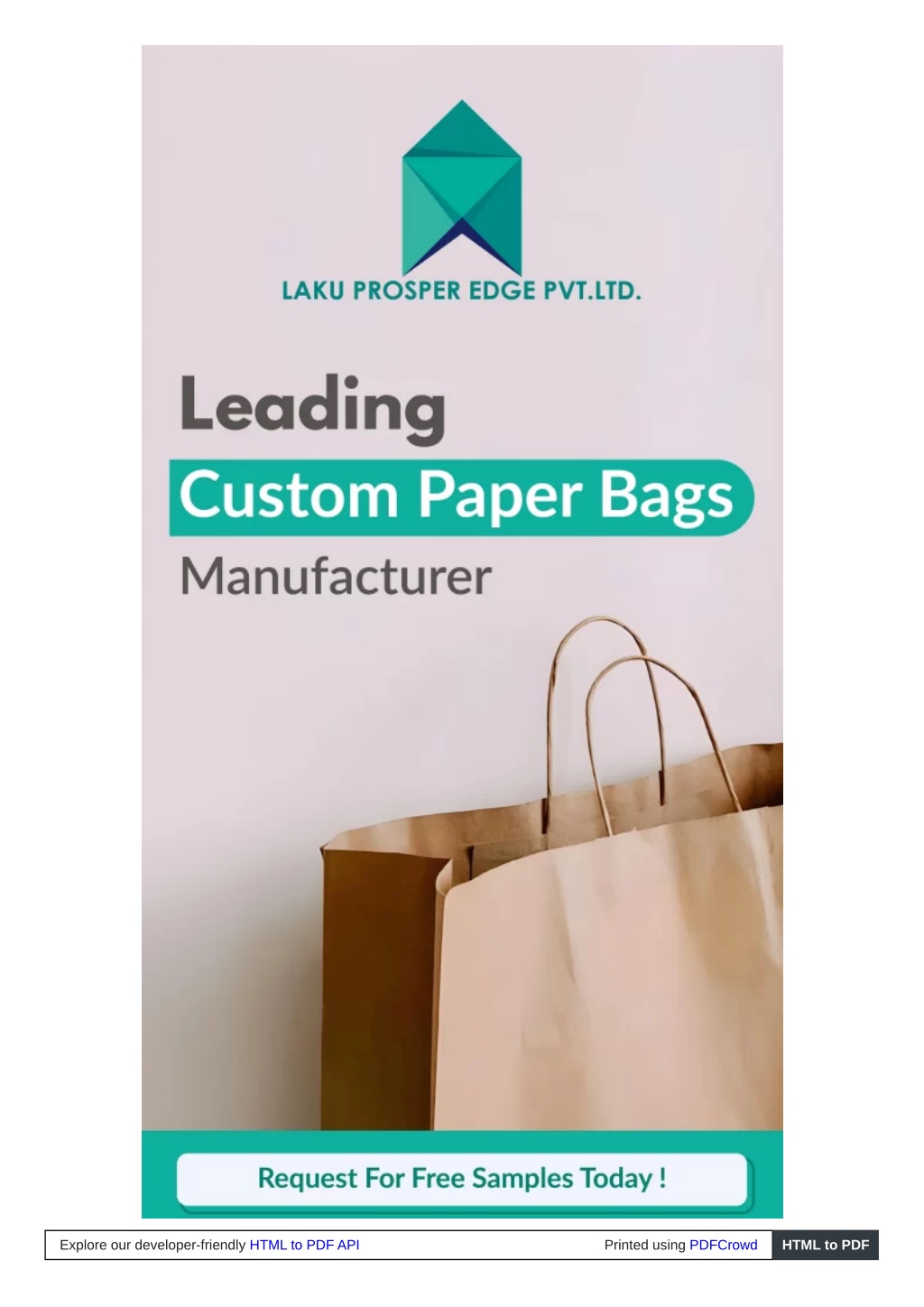 in India, including Laku Prosper Edge are setting benchmarks in quality and innovation, offering a wide range of shopping bags, carry bags, SOS paper bags, and luxury bags to meet market needs. With high-quality paper and advanced bag machines, manufacturers ensure best quality paper bags at the best price. Cities like Delhi and Mumbai have become hubs for manufacture paper bags, supplying recyclable paper bags across India and globally. The industry thrives on cutting-edge production lines, ISO-certi?ed factories, and compliance with GMP, BRCGS, and other international standards, ensuring that printed paper and customized bags meet the highest quality benchmarks. For businesses starting a paper bag making venture, the industry offers lucrative opportunities with minimal working capital. The shift towards eco- friendly products has propelled India’s largest paper bags manufacturers to new heights, with companies like Laku Prosper Edge leading the way in supplying paper bags to retailers and wholesalers. From food packaging to stylish shopping paper bags, Indian manufacturers are meeting the growing demand for best quality and durable solutions. As businesses and consumers prioritize sustainability, the demand for quality paper bags will continue to rise. This comprehensive guide highlights how the best paper bags manufacturers are delivering environmentally friendly, certi?ed, and versatile solutions suitable for various uses. By investing in innovation and offset printing, the Indian paper bags online market is expanding, ensuring a greener future with eco-friendly products made from renewable resources. Explore our developer-friendly HTML to PDF API Printed using PDFCrowd HTML to PDF