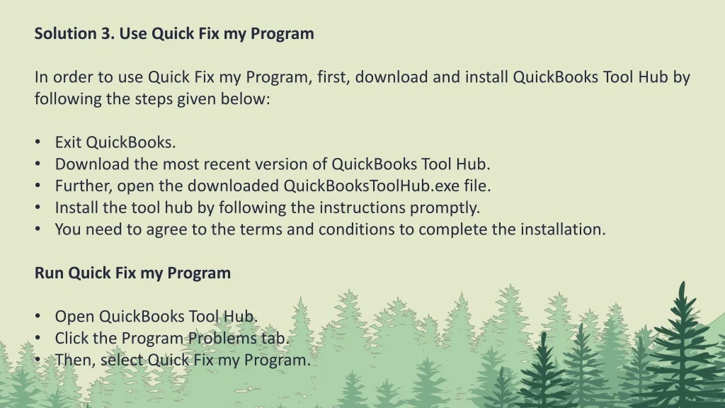 Solution 3. Use Quick Fix my Program • In order to use Quick Fix my Program, first, download and install QuickBooks Tool Hub by following the steps given below: • Exit QuickBooks. • Download the most recent version of QuickBooks Tool Hub. • Further, open the downloaded QuickBooksToolHub.exe file. • Install the tool hub by following the instructions promptly. • You need to agree to the terms and conditions to complete the installation. • Run Quick Fix my Program • Open QuickBooks Tool Hub. • Click the Program Problems tab. • Then, select Quick Fix my Program.