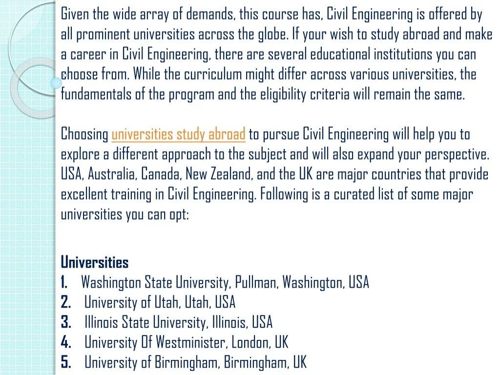 Given the wide array of demands, this course has, Civil Engineering is offered by all prominent universities across the globe. If your wish to study abroad and make a career in Civil Engineering, there are several educational institutions you can choose from. While the curriculum might differ across various universities, the fundamentals of the program and the eligibility criteria will remain the same.Choosing universities study abroad to pursue Civil Engineering will help you to explore a different approach to the subject and will also expand your perspective. USA, Australia, Canada, New Zealand, and the UK are major countries that provide excellent training in Civil Engineering. Following is a curated list of some major universities you can opt: Universities 1. Washington State University, Pullman, Washington, USA2. University of Utah, Utah, USA3. Illinois State University, Illinois, USA4. University Of Westminister, London, UK5. University of Birmingham, Birmingham, UK