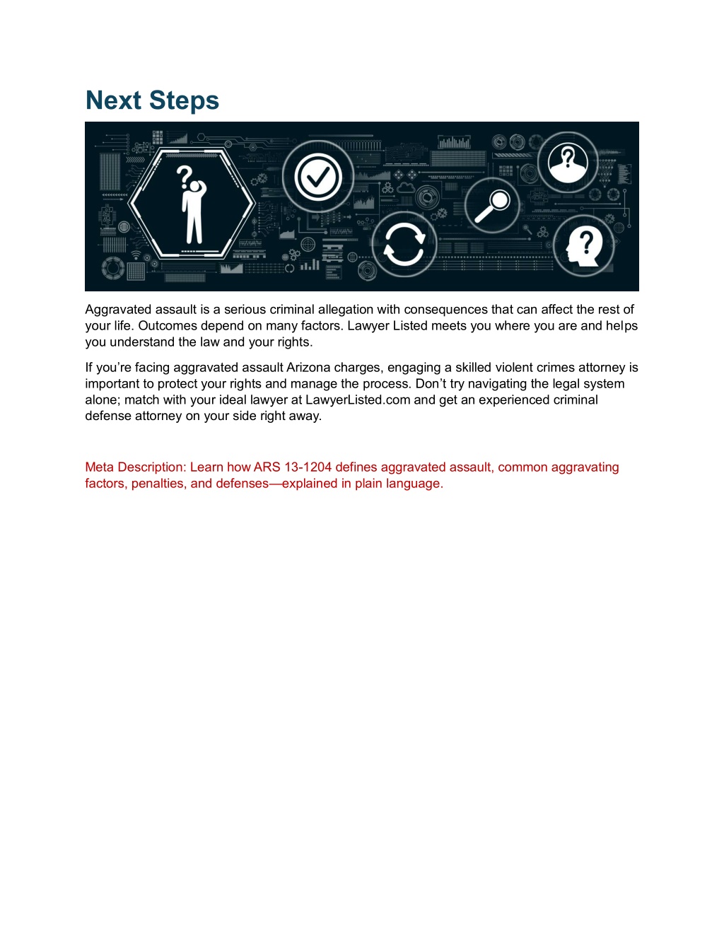 Next Steps Aggravated assault is a serious criminal allegation with consequences that can affect the rest of your life. Outcomes depend on many factors. Lawyer Listed meets you where you are and helps you understand the law and your rights. If you’re facing aggravated assault Arizona charges, engaging a skilled violent crimes attorney is important to protect your rights and manage the process. Don’t try navigating the legal system alone; match with your ideal lawyer at LawyerListed.com and get an experienced criminal defense attorney on your side right away. Meta Description: Learn how ARS 13-1204 defines aggravated assault, common aggravating factors, penalties, and defenses—explained in plain language.