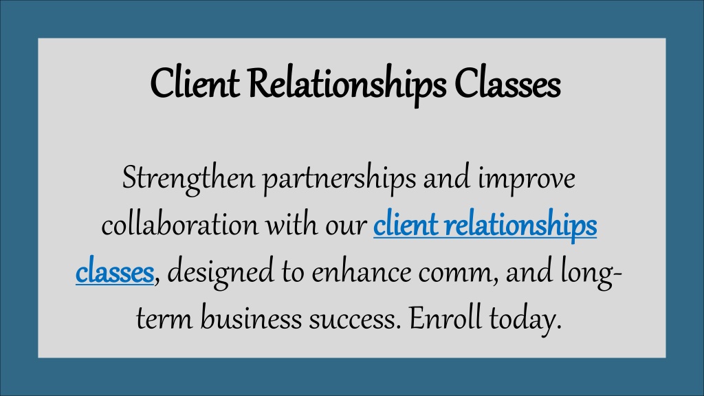 Client Relationships Classes Strengthen partnerships and improve collaboration with our client relationships classes, designed to enhance comm, and long-term business success. Enroll today.