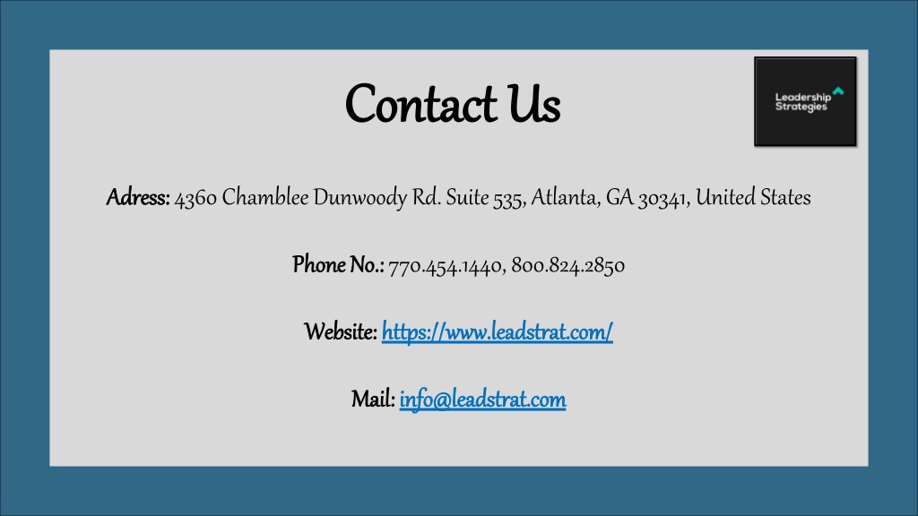 Contact Us Adress:4360 Chamblee Dunwoody Rd. Suite 535, Atlanta, GA 30341, United States Phone No.: 770.454.1440, 800.824.2850 Website: https://www.leadstrat.com/Mail: info@leadstrat.com