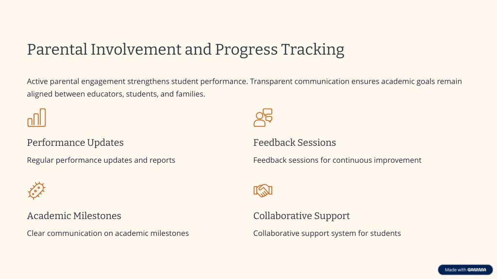 Parental Involvement and Progress Tracking Active parental engagement strengthens student performance. Transparent communication ensures academic goals remain aligned between educators, students, and families. Performance Updates Feedback Sessions Regular performance updates and reports Feedback sessions for continuous improvement Academic Milestones Collaborative Support Clear communication on academic milestones Collaborative support system for students