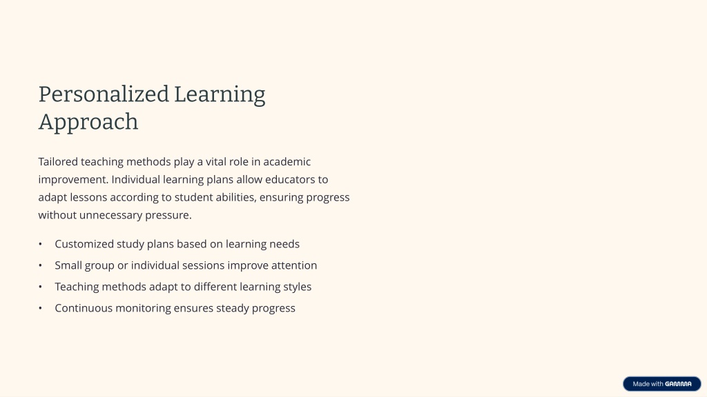 Personalized Learning Approach Tailored teaching methods play a vital role in academic improvement. Individual learning plans allow educators to adapt lessons according to student abilities, ensuring progress without unnecessary pressure. • Customized study plans based on learning needs • Small group or individual sessions improve attention • Teaching methods adapt to different learning styles • Continuous monitoring ensures steady progress