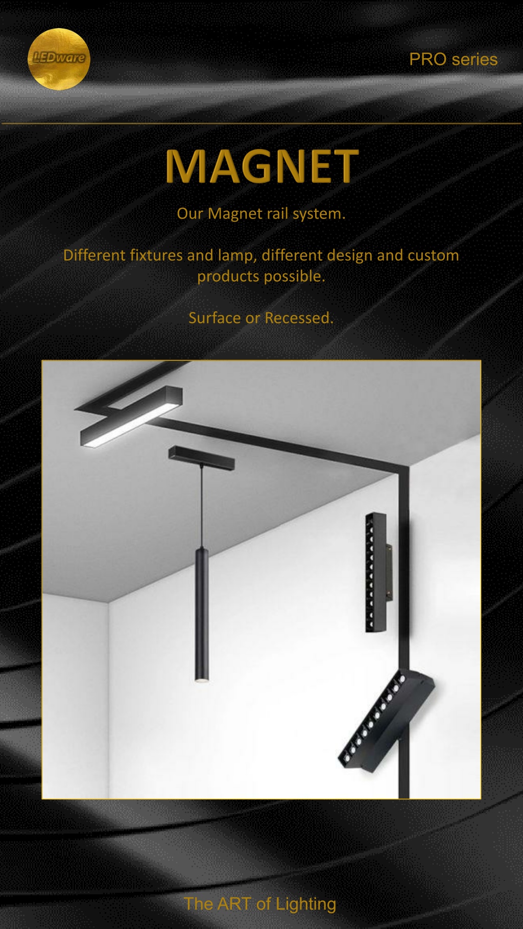 PRO series Our Magnet rail system. Different fixtures and lamp, different design and custom products possible. Surface or Recessed. The ART of Lighting