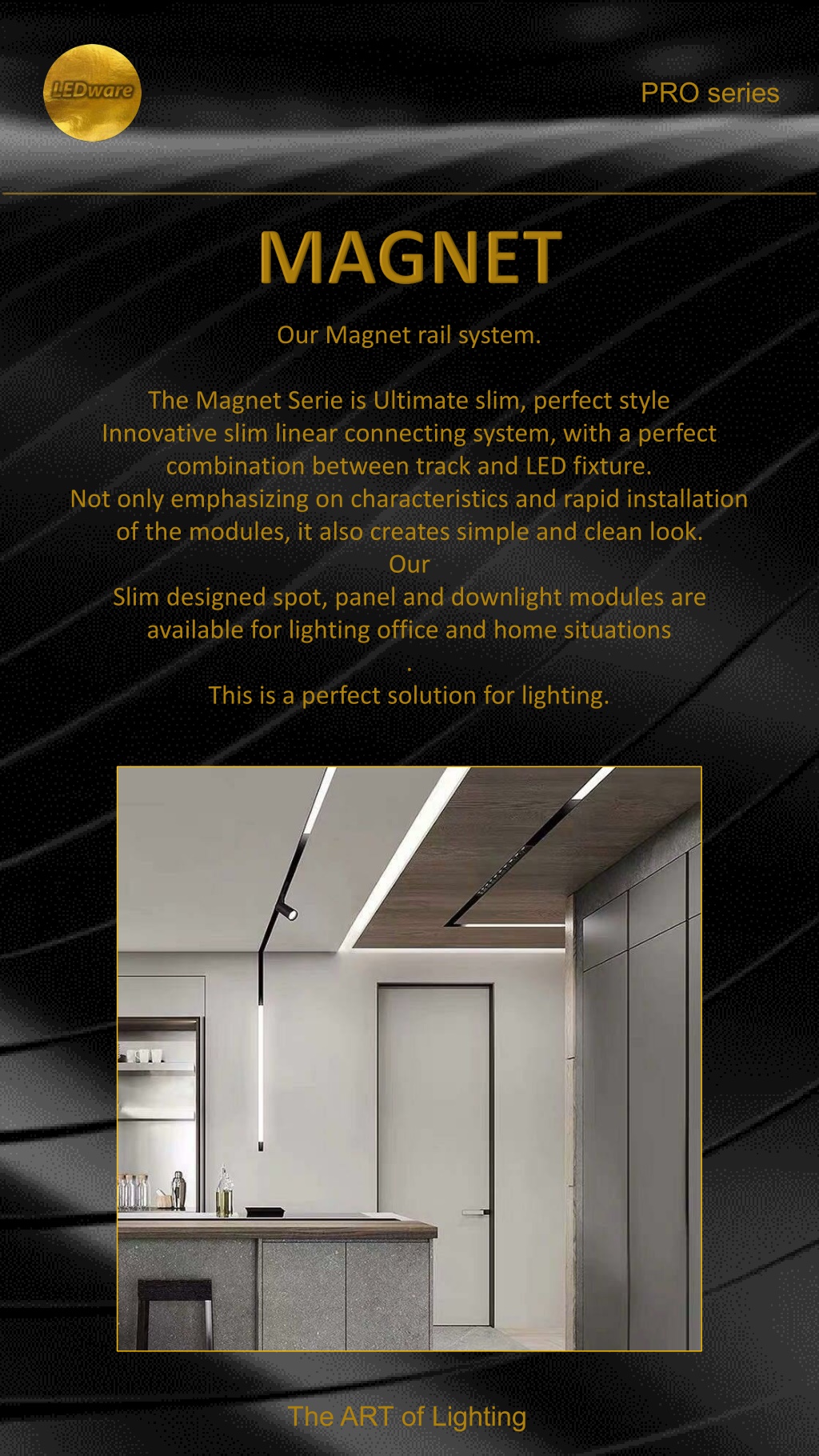 PRO series Our Magnet rail system. The Magnet Serie is Ultimate slim, perfect style Innovative slim linear connecting system, with a perfect combination between track and LED fixture. Not only emphasizing on characteristics and rapid installation of the modules, it also creates simple and clean look. Our Slim designed spot, panel and downlight modules are available for lighting office and home situations . This is a perfect solution for lighting. The ART of Lighting