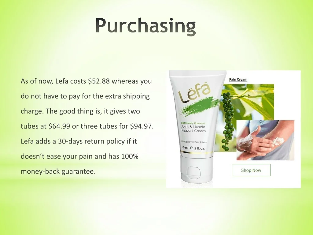 As of now, Lefa costs $52.88 whereas you do not have to pay for the extra shipping charge. The good thing is, it gives two tubes at $64.99 or three tubes for $94.97. Lefa adds a 30-days return policy if it doesn’t ease your pain and has 100% money-back guarantee. Purchasing
