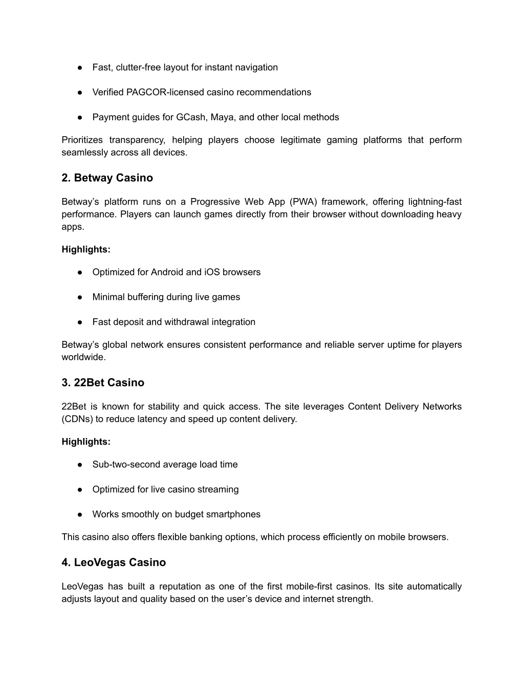 3. ● Fast, clutter-free layout for instant navigation ● Verified PAGCOR-licensed casino recommendations ● Payment guides for GCash, Maya, and other local methods Prioritizes transparency, helping players choose legitimate gaming platforms that perform seamlessly across all devices. 2. Betway Casino Betway’s platform runs on a Progressive Web App (PWA) framework, offering lightning-fast performance. Players can launch games directly from their browser without downloading heavy apps. Highlights: ● Optimized for Android and iOS browsers ● Minimal buffering during live games ● Fast deposit and withdrawal integration Betway’s global network ensures consistent performance and reliable server uptime for players worldwide. 3. 22Bet Casino 22Bet is known for stability and quick access. The site leverages Content Delivery Networks (CDNs) to reduce latency and speed up content delivery. Highlights: ● Sub-two-second average load time ● Optimized for live casino streaming ● Works smoothly on budget smartphones This casino also offers flexible banking options, which process efficiently on mobile browsers. 4. LeoVegas Casino LeoVegas has built a reputation as one of the first mobile-first casinos. Its site automatically adjusts layout and quality based on the user’s device and internet strength.