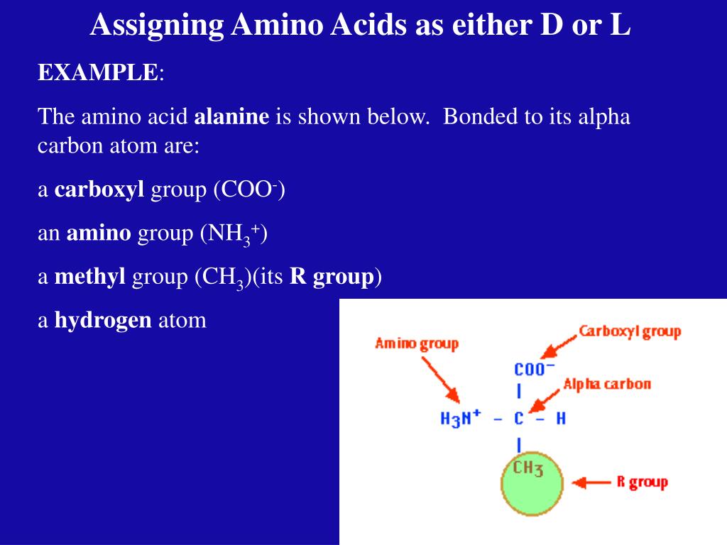 Assigning Amino Acids as either D or L EXAMPLE: The amino acid alanine is shown below. Bonded to its alpha carbon atom are: a carboxyl group (COO-) an amino group (NH3+) a methyl group (CH3)(its R group) a hydrogen atom