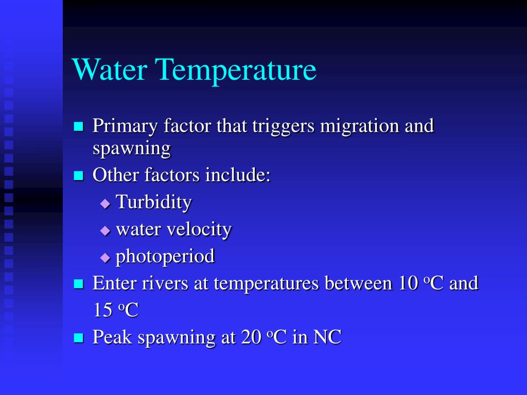 Water Temperature • Primary factor that triggers migration and spawning • Other factors include: • Turbidity • water velocity • photoperiod • Enter rivers at temperatures between 10 oC and 15 oC • Peak spawning at 20 oC in NC