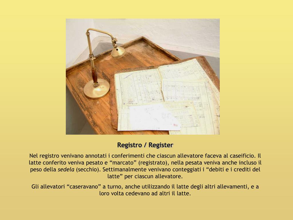 Registro / Register Nel registro venivano annotati i conferimenti che ciascun allevatore faceva al caseificio. Il latte conferito veniva pesato e “marcato” (registrato), nella pesata veniva anche incluso il peso della sedela (secchio). Settimanalmente venivano conteggiati i “debiti e i crediti del latte” per ciascun allevatore. Gli allevatori “caseravano” a turno, anche utilizzando il latte degli altri allevamenti, e a loro volta cedevano ad altri il latte.