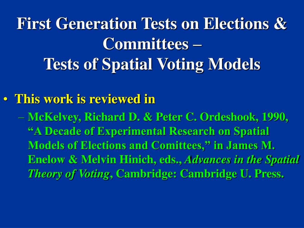 First Generation Tests on Elections & Committees – Tests of Spatial Voting Models • This work is reviewed in • McKelvey, Richard D. & Peter C. Ordeshook, 1990, “A Decade of Experimental Research on Spatial Models of Elections and Comittees,” in James M. Enelow & Melvin Hinich, eds., Advances in the Spatial Theory of Voting, Cambridge: Cambridge U. Press.
