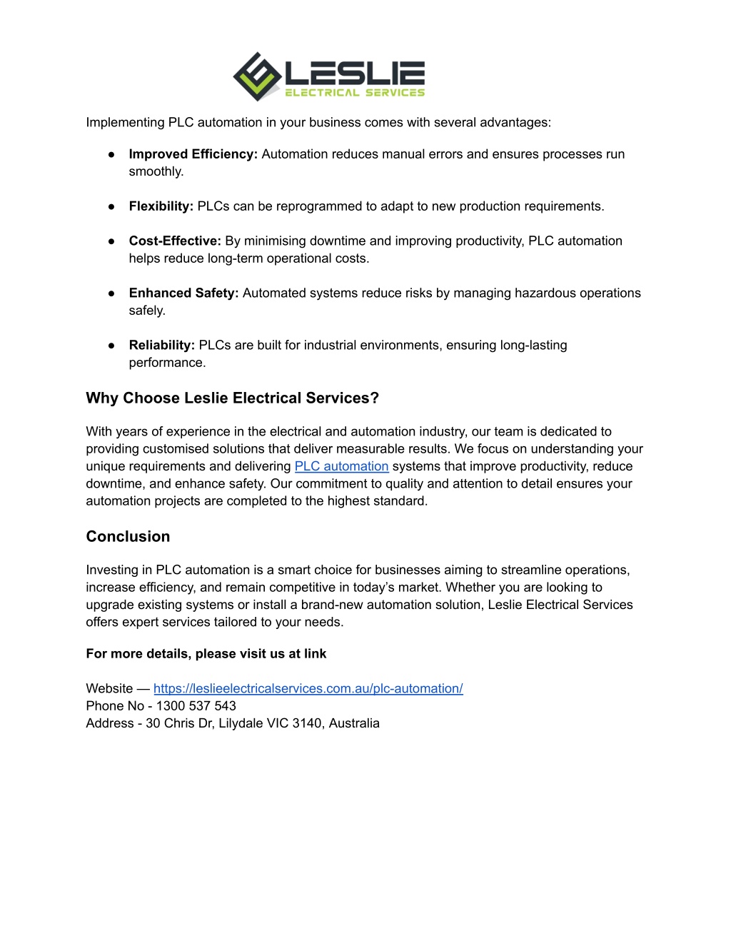 Implementing PLC automation in your business comes with several advantages: ● Improved Efficiency: Automation reduces manual errors and ensures processes run smoothly. ● Flexibility: PLCs can be reprogrammed to adapt to new production requirements. ● Cost-Effective: By minimising downtime and improving productivity, PLC automation helps reduce long-term operational costs. ● Enhanced Safety: Automated systems reduce risks by managing hazardous operations safely. ● Reliability: PLCs are built for industrial environments, ensuring long-lasting performance. Why Choose Leslie Electrical Services? With years of experience in the electrical and automation industry, our team is dedicated to providing customised solutions that deliver measurable results. We focus on understanding your unique requirements and delivering PLC automation systems that improve productivity, reduce downtime, and enhance safety. Our commitment to quality and attention to detail ensures your automation projects are completed to the highest standard. Conclusion Investing in PLC automation is a smart choice for businesses aiming to streamline operations, increase efficiency, and remain competitive in today’s market. Whether you are looking to upgrade existing systems or install a brand-new automation solution, Leslie Electrical Services offers expert services tailored to your needs. For more details, please visit us at link Website — https://leslieelectricalservices.com.au/plc-automation/ Phone No - 1300 537 543 Address - 30 Chris Dr, Lilydale VIC 3140, Australia