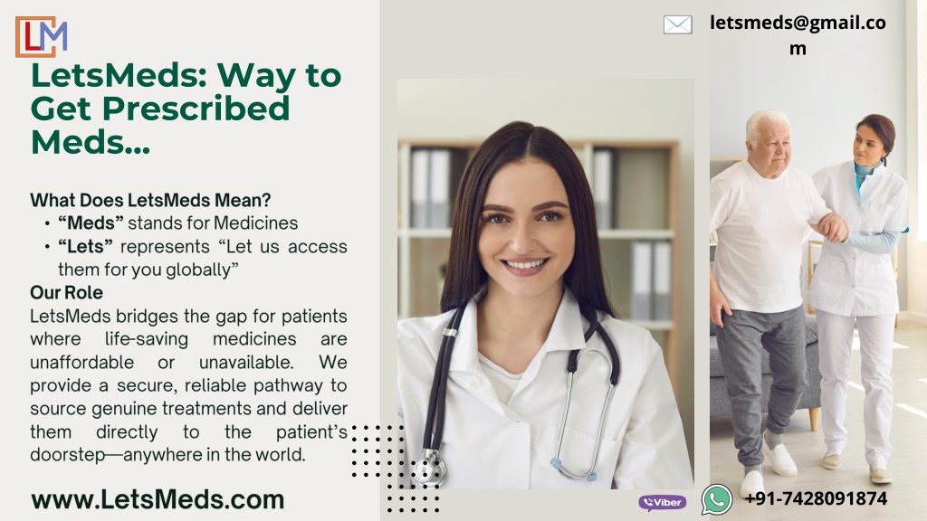 letsmeds@gmail.com LetsMeds: Way to Get Prescribed Meds... • What Does LetsMeds Mean? • “Meds” stands for Medicines • “Lets” represents “Let us access them for you globally” • Our Role • LetsMeds bridges the gap for patients where life-saving medicines are unaffordable or unavailable. We provide a secure, reliable pathway to source genuine treatments and deliver them directly to the patient’s doorstep—anywhere in the world. www.LetsMeds.com +91-7428091874