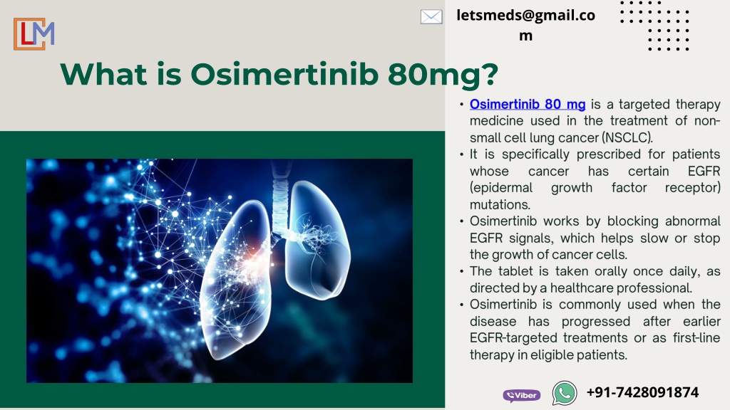 letsmeds@gmail.com What is Osimertinib 80mg? • Osimertinib 80 mg is a targeted therapy medicine used in the treatment of non-small cell lung cancer (NSCLC). • It is specifically prescribed for patients whose cancer has certain EGFR (epidermal growth factor receptor) mutations. • Osimertinib works by blocking abnormal EGFR signals, which helps slow or stop the growth of cancer cells. • The tablet is taken orally once daily, as directed by a healthcare professional. • Osimertinib is commonly used when the disease has progressed after earlier EGFR-targeted treatments or as first-line therapy in eligible patients. +91-7428091874