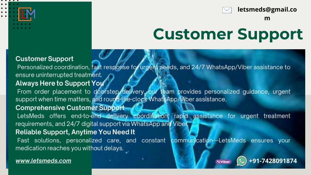 letsmeds@gmail.com Customer Support Customer Support Personalized coordination, fast response for urgent needs, and 24/7 WhatsApp/Viber assistance to ensure uninterrupted treatment. Always Here to Support You From order placement to doorstep delivery, our team provides personalized guidance, urgent support when time matters, and round-the-clock WhatsApp/Viber assistance. Comprehensive Customer Support LetsMeds offers end-to-end delivery coordination, rapid assistance for urgent treatment requirements, and 24/7 digital support via WhatsApp and Viber. Reliable Support, Anytime You Need It Fast solutions, personalized care, and constant communication—LetsMeds ensures your medication reaches you without delays. +91-7428091874 www.letsmeds.com