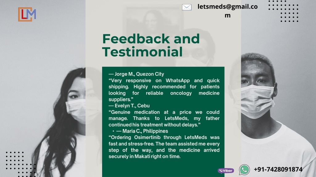 letsmeds@gmail.com Feedback and Testimonial • — Jorge M., Quezon City • “Very responsive on WhatsApp and quick shipping. Highly recommended for patients looking for reliable oncology medicine suppliers.” • — Evelyn T., Cebu • “Genuine medication at a price we could manage. Thanks to LetsMeds, my father continued his treatment without delays.” • — Maria C., Philippines • “Ordering Osimertinib through LetsMeds was fast and stress-free. The team assisted me every step of the way, and the medicine arrived securely in Makati right on time. +91-7428091874