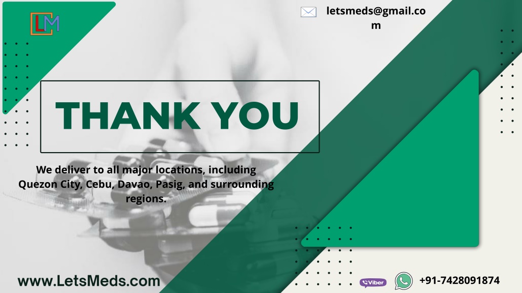 letsmeds@gmail.com THANK YOU We deliver to all major locations, including Quezon City, Cebu, Davao, Pasig, and surrounding regions. www.LetsMeds.com +91-7428091874
