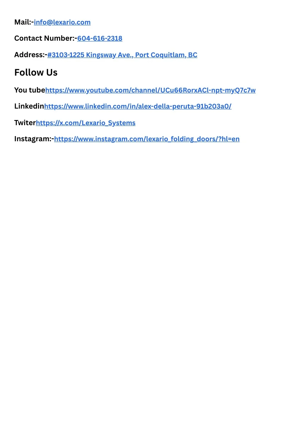 Mail:-info@lexario.com Contact Number:-604-616-2318 Address:-#3103-1225 Kingsway Ave., Port Coquitlam, BC Follow Us You tubehttps://www.youtube.com/channel/UCu66RorxACl-npt-myQ7c7w Linkedinhttps://www.linkedin.com/in/alex-della-peruta-91b203a0/ Twiterhttps://x.com/Lexario_Systems Instagram:-https://www.instagram.com/lexario_folding_doors/?hl=en