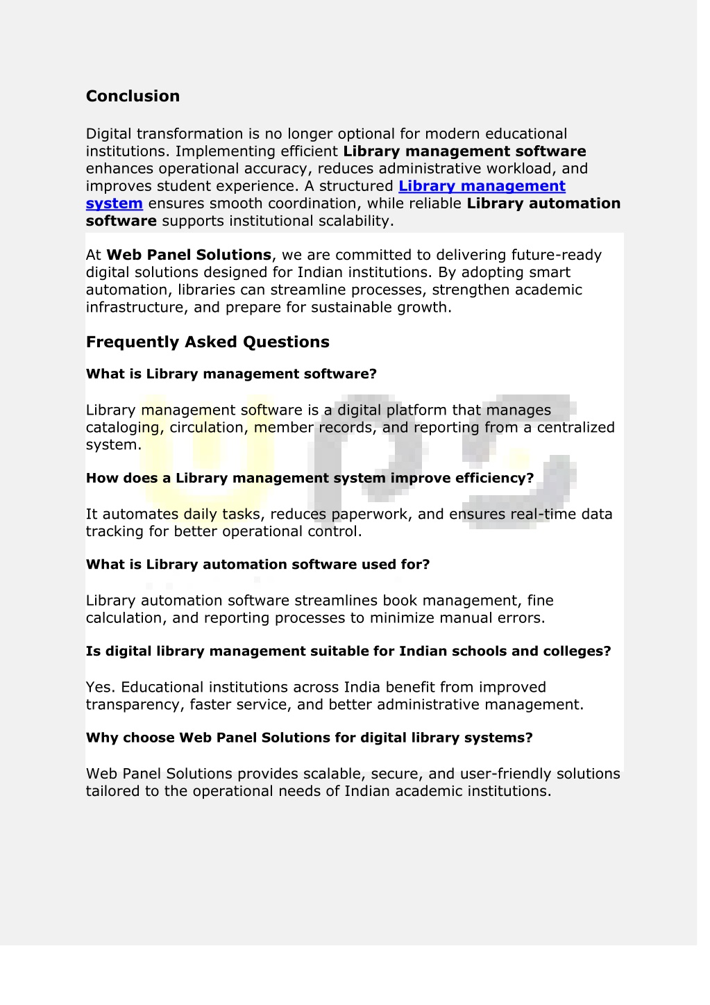 Conclusion Digital transformation is no longer optional for modern educational institutions. Implementing efficient Library management software enhances operational accuracy, reduces administrative workload, and improves student experience. A structured Library management system ensures smooth coordination, while reliable Library automation software supports institutional scalability. At Web Panel Solutions, we are committed to delivering future-ready digital solutions designed for Indian institutions. By adopting smart automation, libraries can streamline processes, strengthen academic infrastructure, and prepare for sustainable growth. Frequently Asked Questions What is Library management software? Library management software is a digital platform that manages cataloging, circulation, member records, and reporting from a centralized system. How does a Library management system improve efficiency? It automates daily tasks, reduces paperwork, and ensures real-time data tracking for better operational control. What is Library automation software used for? Library automation software streamlines book management, fine calculation, and reporting processes to minimize manual errors. Is digital library management suitable for Indian schools and colleges? Yes. Educational institutions across India benefit from improved transparency, faster service, and better administrative management. Why choose Web Panel Solutions for digital library systems? Web Panel Solutions provides scalable, secure, and user-friendly solutions tailored to the operational needs of Indian academic institutions.