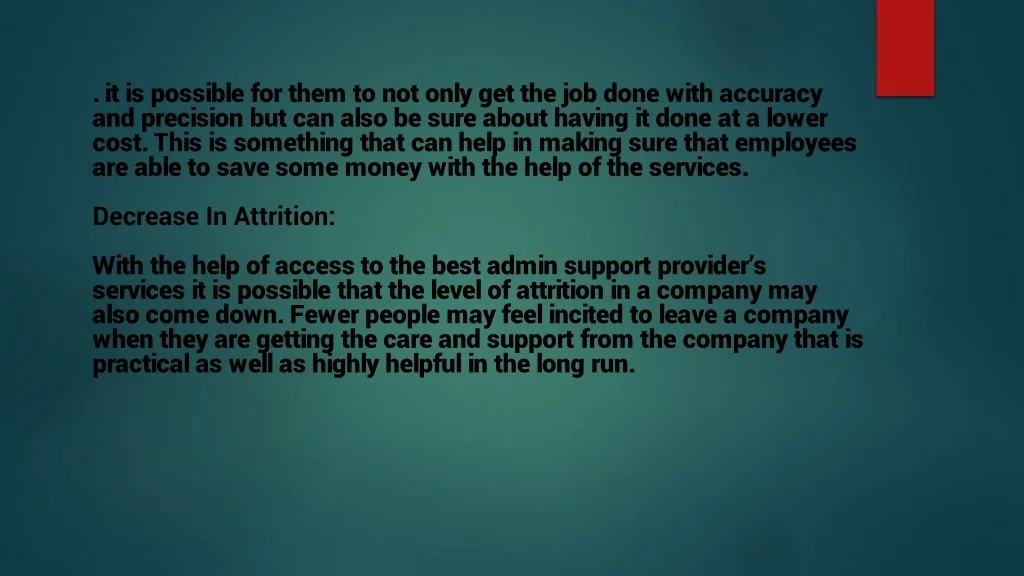. it is possible for them to not only get the job done with accuracy and precision but can also be sure about having it done at a lower cost. This is something that can help in making sure that employees are able to save some money with the help of the services. Decrease In Attrition: With the help of access to the best admin support provider’s services it is possible that the level of attrition in a company may also come down. Fewer people may feel incited to leave a company when they are getting the care and support from the company that is practical as well as highly helpful in the long run.